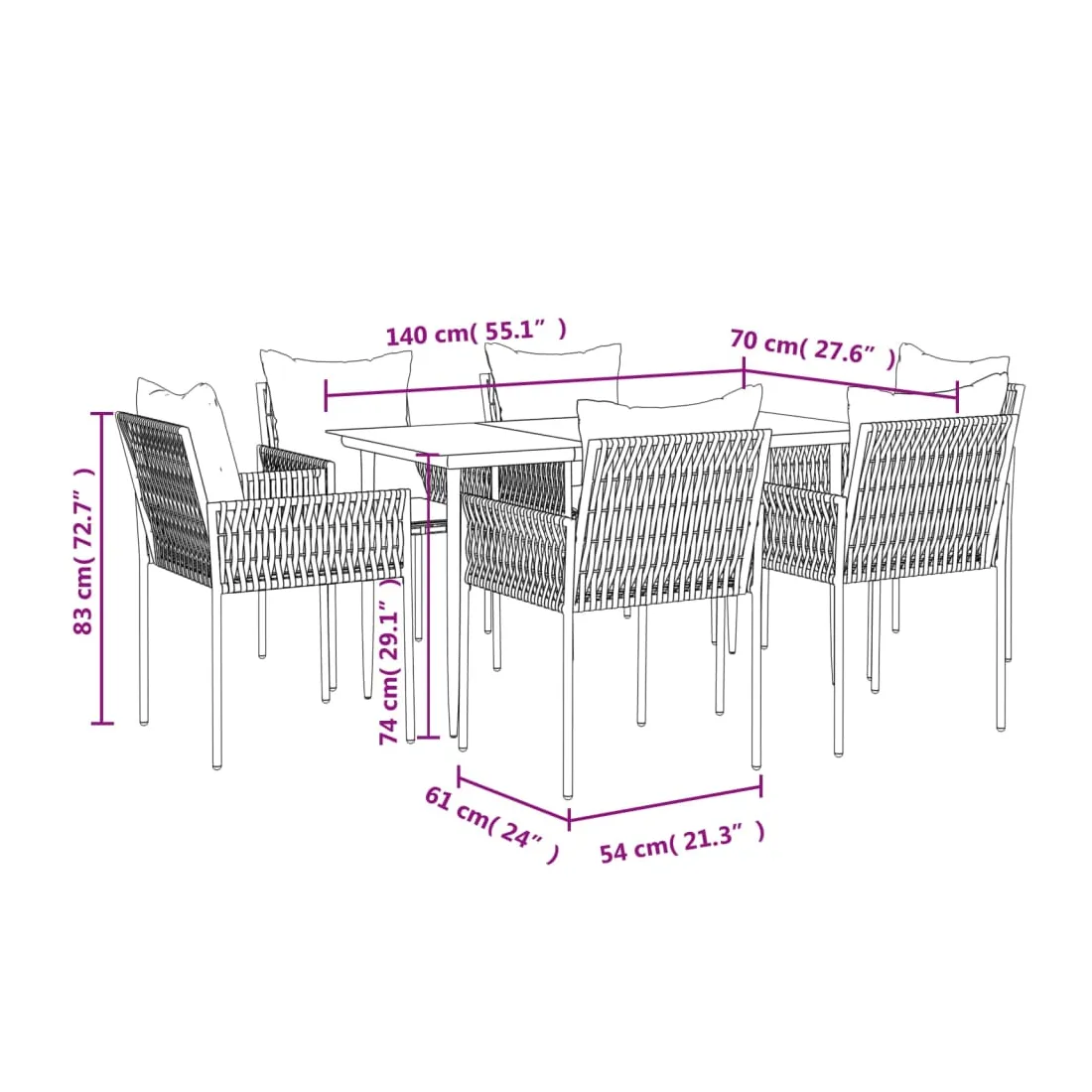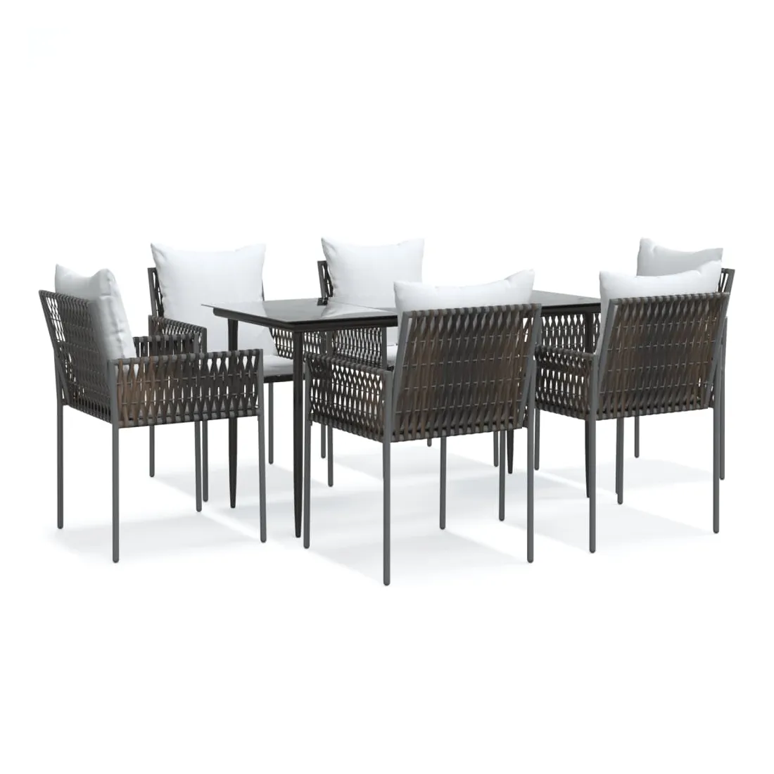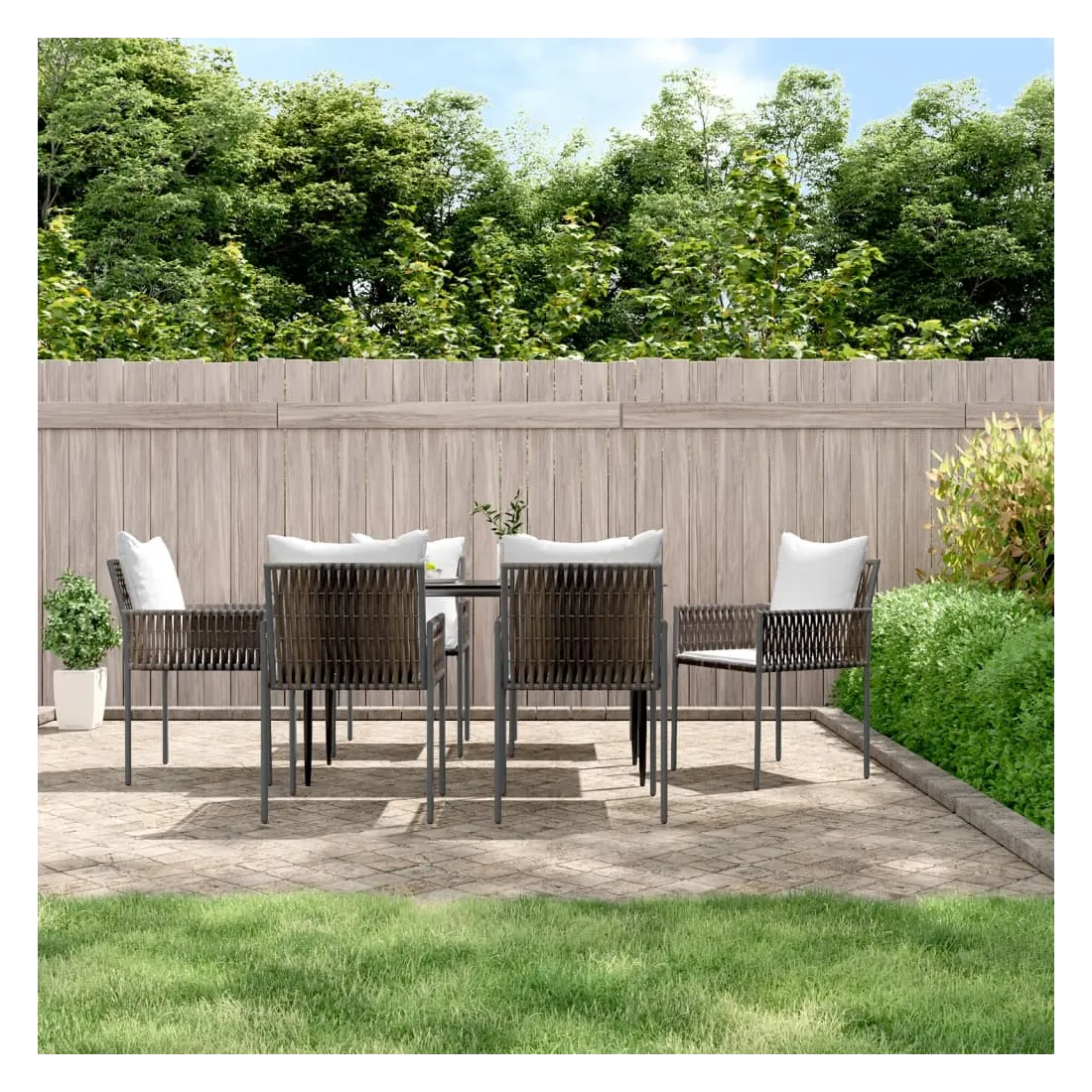 Détendez-vous et profitez d'un bon thé de l'après-midi ou de n'importe quel repas avec votre famille et vos amis autour de cet ensemble de salle à manger de jardin ! Matériau durable : la résine tressée, également connue sous le nom de rotin poly, résiste aux intempéries et est facile à nettoyer. Elle reste belle à l'extérieur pendant une longue période. Elle offre une excellente qualité, commodité et un aspect esthétique.Cadre robuste et stable : les cadres en acier rendent l'ensemble à manger robuste et stable pour une utilisation quotidienne à l'extérieur.Dessus de table pratique : le plateau lisse de la table à manger est en verre trempé facile à nettoyer avec un chiffon humide. De plus, il offre un excellent support pour contenir vos repas, boissons et autres objets décoratifs.Assise confortable : la chaise à manger est conçue avec un dossier et des accoudoirs pour vous offrir une expérience d'assise confortable. De plus, les coussins épais rembourrés offrent un confort ultime pour votre temps d'assise. Remarque :Pour que vos meubles d'extérieur restent beaux, nous vous recommandons de les protéger avec une housse imperméable.