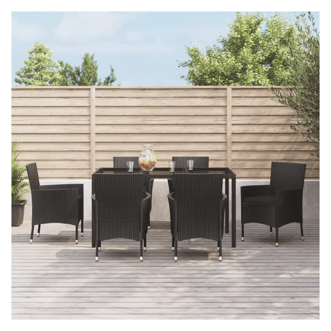 vidaXLCet ensemble élégant de salle à manger de jardin vous permet de passer des moments agréables et confortables avec votre famille et vos amis. Matériau résistant aux intempéries : la résine tressée, également connue sous le nom de rotin poly, résiste aux intempéries et est facile à nettoyer. Elle reste belle à l'extérieur pendant une longue période. Elle offre une excellente qualité, commodité et un aspect esthétique. Cadre robuste et stable : le cadre en acier enduit de poudre de l'ensemble à manger assure robustesse et stabilité. Expérience d'assise confortable : les coussins bien rembourrés des chaises à manger offrent un confort ultime pour votre temps d'assise.Table pratique : le dessus lisse de la table de salle à manger est en verre trempé, facile à nettoyer avec un chiffon humide. De plus, le dessus robuste est parfait pour placer des repas, des boissons et d'autres objets décoratifs.Conception flexible : grâce à la construction légère, ces chaises à dîner de jardin sont faciles à déplacer. Remarque :Pour que vos meubles d'extérieur restent beaux, nous vous recommandons de les protéger avec une housse imperméable.