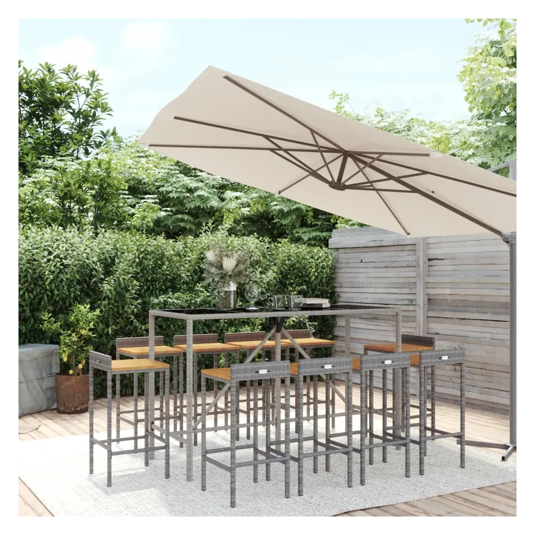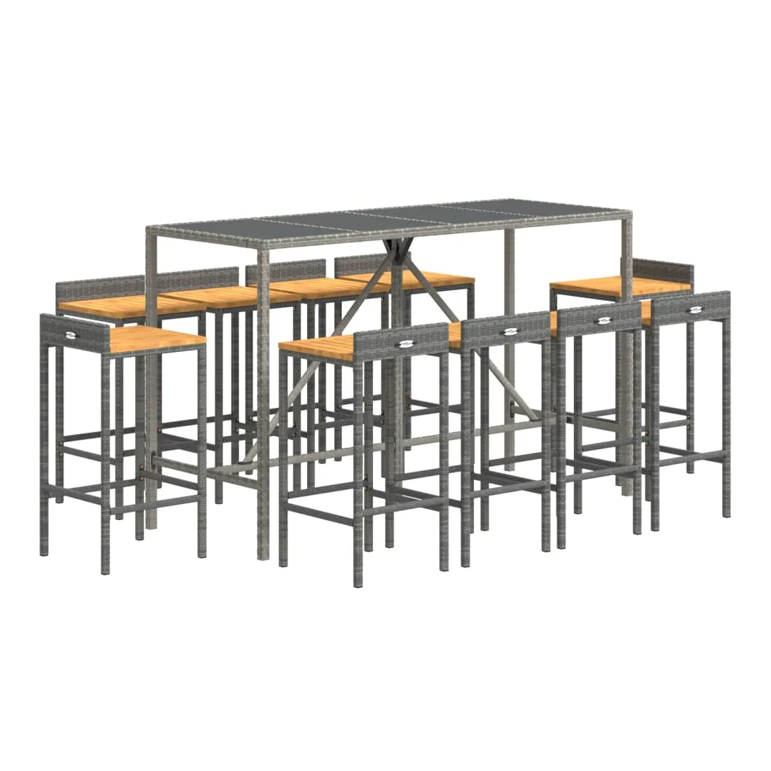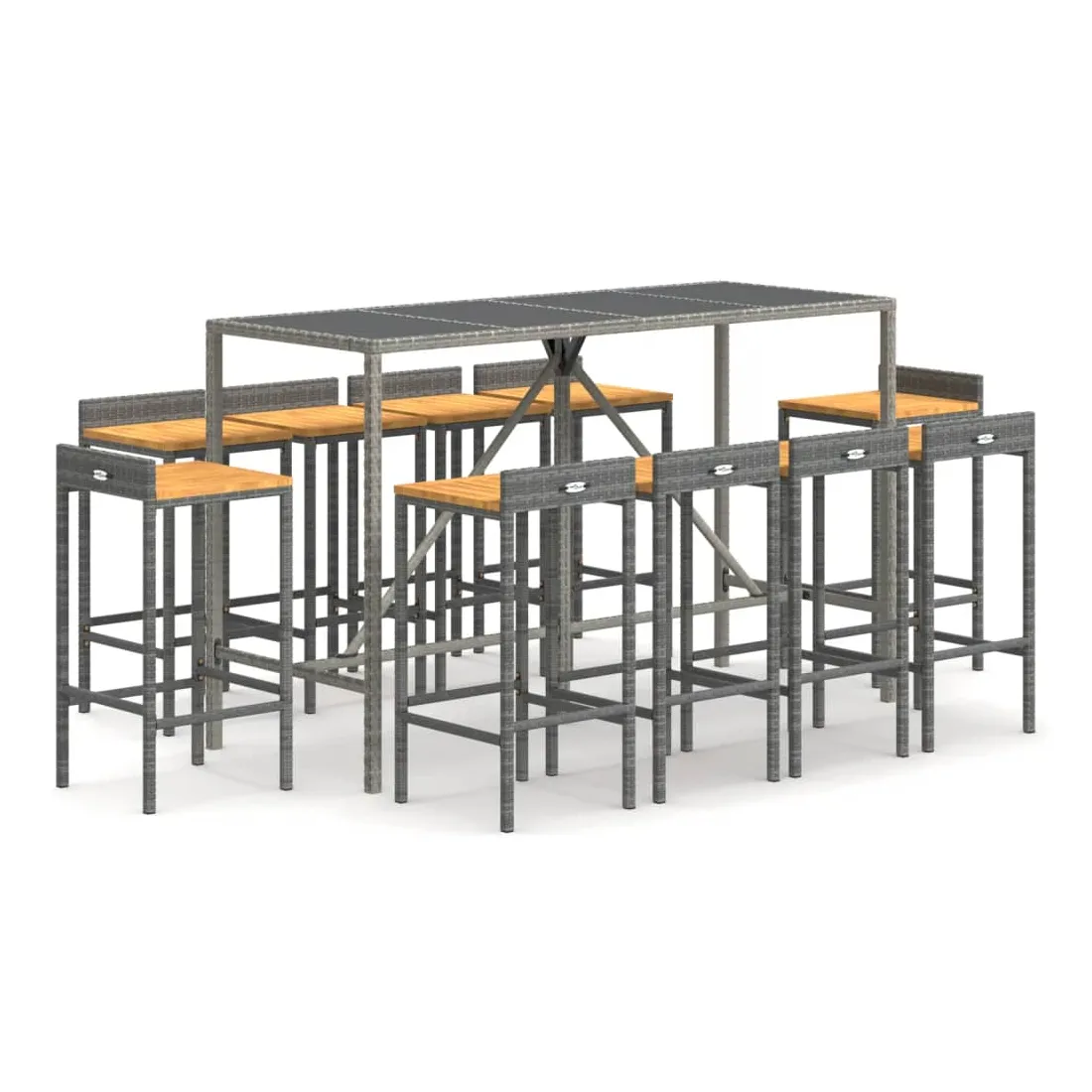 Cet ensemble de bar de jardin tendance, combinant à la fois style et fonctionnalité, est sûrement destiné à être la pièce maîtresse de votre jardin, terrasse et de tout autre espace de vie. Matériau résistant aux intempéries : la résine tressée, également connue sous le nom de rotin poly, résiste aux intempéries et est facile à nettoyer. Elle reste belle à l'extérieur pendant une longue période. Elle offre une excellente qualité, commodité et un aspect esthétique.Assise confortable : le tabouret de bar est conçu avec un repose-pied intégré pour vous offrir une expérience d'assise confortable. L'assise en bois confère au tabouret un aspect naturel et agréable tout en assurant sa stabilité.Dessus en verre trempé : le dessus est en verre trempé, ce qui le rend facile à nettoyer. De plus, il est idéal pour placer vos boissons, collations et vos décorations préférées.Cadre robuste et stable : les cadres en acier enduit de poudre rendent l'ensemble de pub robuste et stable pour une utilisation quotidienne à l'extérieur.Applications larges : la table et les tabourets de bar, avec leur design remarquable, créent un aspect général agréable qui s'intègre sans effort dans n'importe quel décor. Bon à savoir :Pour faciliter au maximum le montage, chaque produit est livré avec des instructions.Remarque :Pour que vos meubles d'extérieur restent beaux, nous vous recommandons de les protéger avec une housse imperméable.
