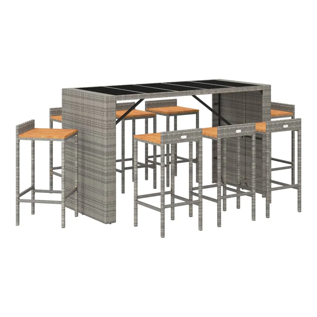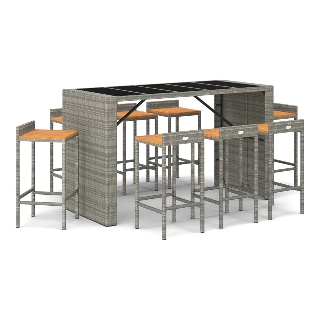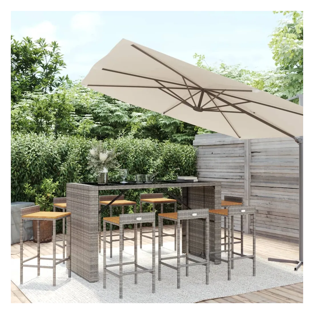 Cet ensemble de bar de jardin tendance, combinant à la fois style et fonctionnalité, est sûrement destiné à être la pièce maîtresse de votre jardin, terrasse et de tout autre espace de vie. Matériau résistant aux intempéries : la résine tressée, également connue sous le nom de rotin poly, résiste aux intempéries et est facile à nettoyer. Elle reste belle à l'extérieur pendant une longue période. Elle offre une excellente qualité, commodité et un aspect esthétique.Assise confortable : le tabouret de bar est conçu avec un repose-pied intégré pour vous offrir une expérience d'assise confortable. L'assise en bois confère au tabouret un aspect naturel et agréable tout en assurant sa stabilité.Dessus en verre trempé : le dessus est en verre trempé, ce qui le rend facile à nettoyer. De plus, il est idéal pour placer vos boissons, collations et vos décorations préférées.Cadre robuste et stable : les cadres en acier enduit de poudre rendent l'ensemble de pub robuste et stable pour une utilisation quotidienne à l'extérieur.Applications larges : la table et les tabourets de bar, avec leur design remarquable, créent un aspect général agréable qui s'intègre sans effort dans n'importe quel décor. Bon à savoir :Pour faciliter au maximum le montage, chaque produit est livré avec des instructions.Remarque :Pour que vos meubles d'extérieur restent beaux, nous vous recommandons de les protéger avec une housse imperméable.