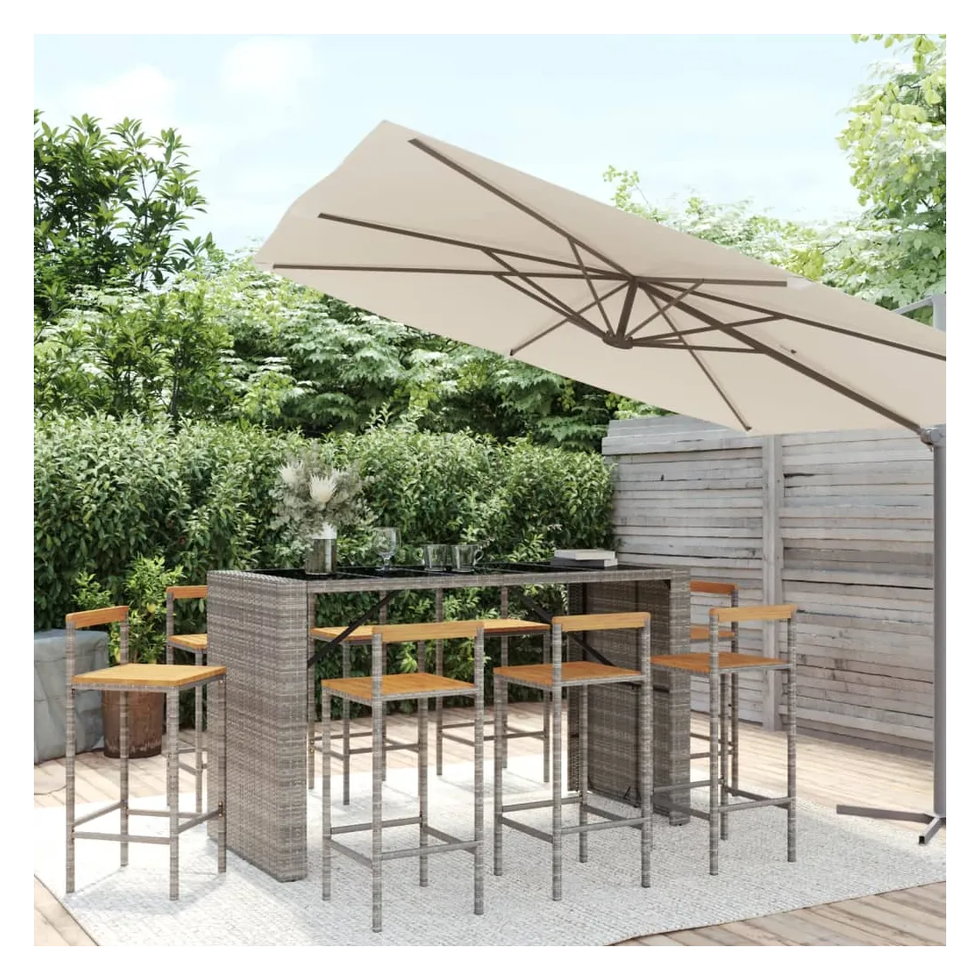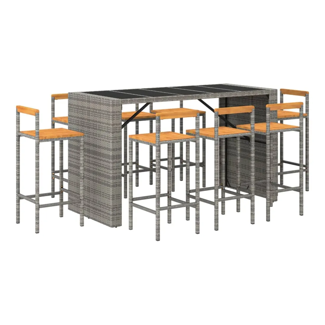 Cet ensemble de bar de jardin tendance, combinant à la fois style et fonctionnalité, est sûrement destiné à être la pièce maîtresse de votre jardin, terrasse et de tout autre espace de vie. Matériau résistant aux intempéries : la résine tressée, également connue sous le nom de rotin poly, résiste aux intempéries et est facile à nettoyer. Elle reste belle à l'extérieur pendant une longue période. Elle offre une excellente qualité, commodité et un aspect esthétique.Assise confortable : la chaise de bar est conçue avec un repose-pieds intégré et un dossier en bois pour vous offrir une expérience d'assise confortable. L'assise en bois confère à la chaise un aspect naturel et agréable tout en assurant sa stabilité.Dessus en verre trempé : le dessus est en verre trempé, ce qui le rend facile à nettoyer. De plus, il est idéal pour placer vos boissons, collations et vos décorations préférées.Cadre robuste et stable : les cadres en acier enduit de poudre rendent l'ensemble de pub robuste et stable pour une utilisation quotidienne à l'extérieur.Applications larges : la table et les chaises de bar, avec leur design remarquable, créent un aspect général agréable qui s'intègre sans effort dans n'importe quel décor. Bon à savoir :Pour faciliter au maximum le montage, chaque produit est livré avec des instructions.Remarque :Pour que vos meubles d'extérieur restent beaux, nous vous recommandons de les protéger avec une housse imperméable.