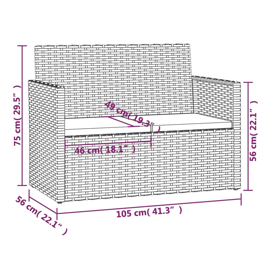 - Dimensions du canapé double : 105 x 56 x 75 cm (l x P x H)