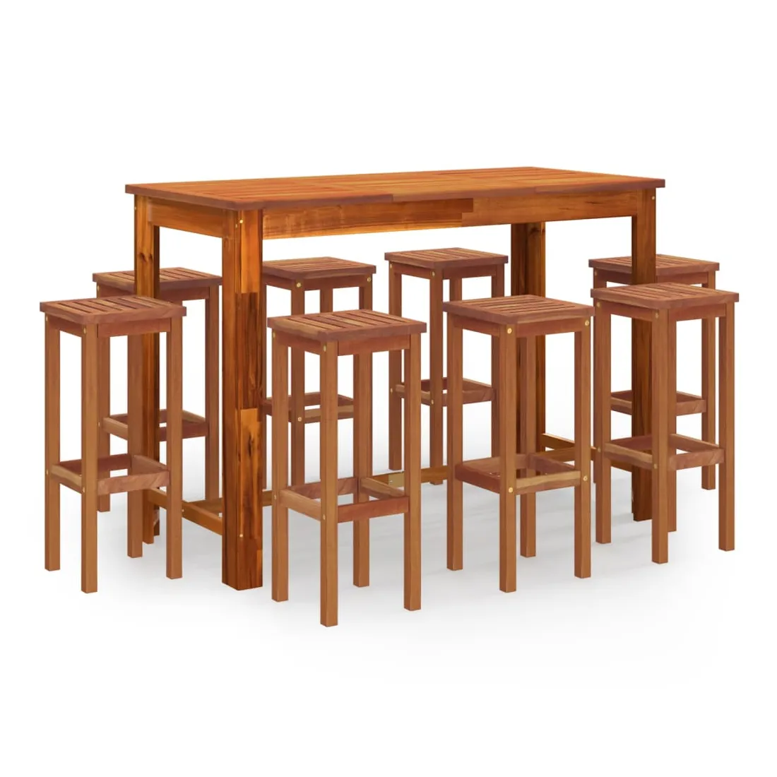 Cet ensemble de bar de jardin en bois a un design élégant et est destiné à être le point central de votre jardin, patio ou terrasse. Matériau pratique : le bois d'acacia massif est un magnifique matériau naturel. Le bois d'acacia est un bois dur tropical, dense, robuste et durable. De plus, la surface à finition à l'huile facilite le nettoyage de la table et des chaises de jardin.Structure solide et robuste : les cadres en bois de l'ensemble de salle à manger d'extérieur garantissent la solidité et la stabilité.Tabourets de bar confortables : les repose-pieds offrent un confort d'assise supplémentaire.Look intemporel : le design épuré de la table de bistrot et des tabourets en bois en fait un investissement intemporel pour votre maison. Remarque :Afin de prolonger la durée de vie de votre mobilier d'extérieur, nous vous recommandons de le protéger avec une housse imperméable.