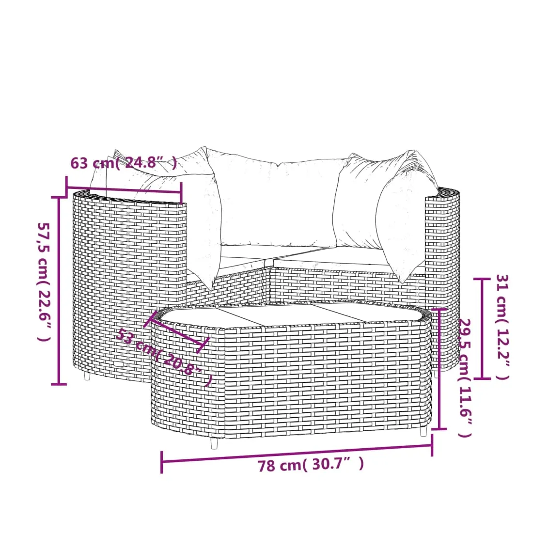 Cet ensemble de salon de jardin tendance, au design élégant et contemporain, est un excellent choix pour manger ou vous détendre dans votre jardin. Matériau résistant aux intempéries : la résine tressée, également connue sous le nom de rotin poly, résiste aux intempéries et est facile à nettoyer. Elle reste belle à l'extérieur pendant une longue période. Elle offre une excellente qualité, commodité et un aspect esthétique.Cadre robuste : les cadres en acier enduit de poudre rendent l'ensemble de salon d'extérieur robuste et stable pour une utilisation quotidienne à l'extérieur.Dessus de table pratique : le dessus lisse de la table de jardin est en verre trempé, facile à nettoyer avec un chiffon humide. De plus, le dessus robuste est parfait pour placer des repas, des boissons et d'autres objets décoratifs.Conception modulaire : l'ensemble de salon de jardin est flexible et facile à déplacer, vous pouvez donc le combiner avec d'autres segments modulaires dans la boutique en ligne pour créer vos propres configurations d'ensemble de salon de jardin !Expérience d'assise confortable : le dossier ajoute un confort d'assise supplémentaire au canapé de jardin. De plus, les coussins bien rembourrés offrent du confort pendant votre temps d'assise. Bon à savoir :Pour faciliter au maximum le montage, chaque produit est livré avec des instructions. Remarque :Le produit est conçu pour une utilisation à l'extérieur uniquement. Ne le rangez pas à l'intérieur.Pour que vos meubles d'extérieur restent beaux, nous vous recommandons de les protéger avec une housse imperméable.