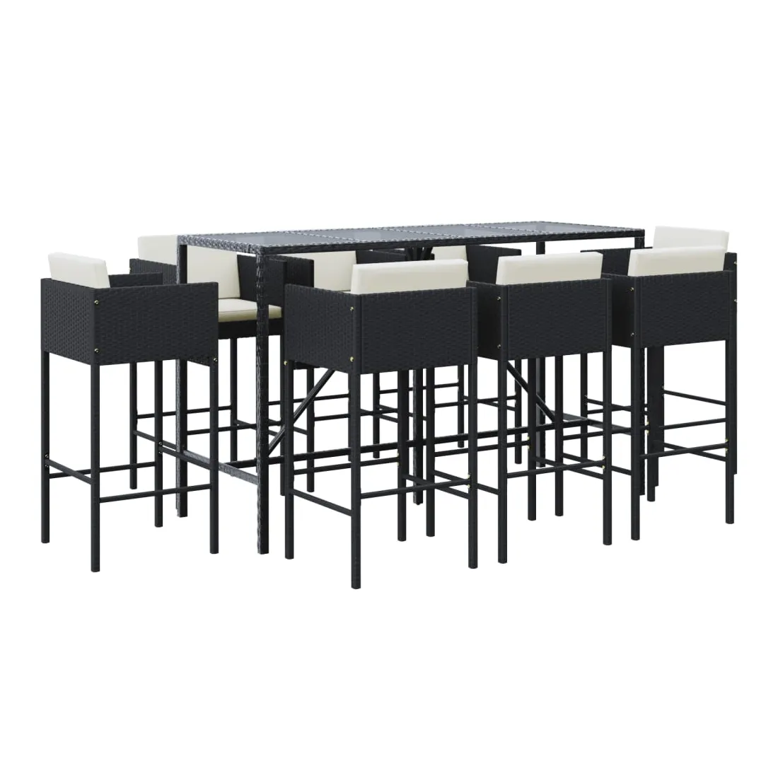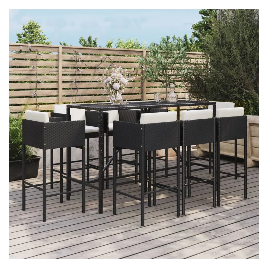 Cet ensemble de bar de jardin tendance, combinant à la fois style et fonctionnalité, est sûrement destiné à être la pièce maîtresse de votre jardin, terrasse et de tout autre espace de vie. Matériau résistant aux intempéries : la résine tressée, également connue sous le nom de rotin poly, résiste aux intempéries et est facile à nettoyer. Elle reste belle à l'extérieur pendant une longue période. Elle offre une excellente qualité, commodité et un aspect esthétique.Siège confortable : le tabouret de bar est conçu avec un repose-pied, un dossier et des accoudoirs pour vous offrir une expérience d'assise confortable. Les coussins souples du siège et du dossier ajoutent encore au confort.Dessus en verre trempé : le dessus est en verre trempé, ce qui le rend facile à nettoyer. De plus, il offre un excellent support pour placer vos boissons, collations et vos décorations préférées.Cadre robuste et stable : les cadres en acier enduit de poudre rendent l'ensemble de pub robuste et stable pour une utilisation quotidienne à l'extérieur.Applications larges : la table et les tabourets de bar, avec leur design remarquable, créent un aspect général agréable qui s'intègre sans effort dans n'importe quel décor. Bon à savoir :Pour que vos meubles d'extérieur restent beaux, nous vous recommandons de les protéger avec une housse imperméable.