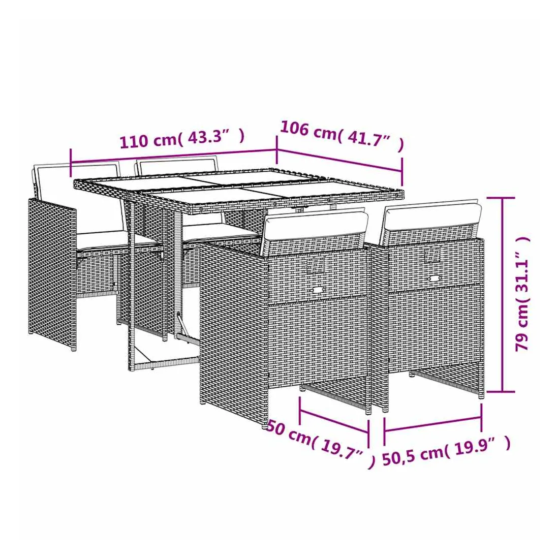 Cet ensemble de salle à manger de jardin est un excellent choix pour les repas en plein air ou pour vous détendre dans le jardin, dans l'arrière-cour ou sur la terrasse. Matériau durable : la résine tressée, également connue sous le nom de poly rotin, est un matériau synthétique solide et nécessitant peu d'entretien qui ressemble au rotin naturel. Il est léger, facile à nettoyer et couramment utilisé pour les meubles d'extérieur en raison de sa durabilité et de ses propriétés de résistance aux intempéries.Rangement compact : ces chaises sont dotées d'un dossier rabattable, ce qui permet de les ranger facilement sous la table. Une fois pliées, elles se rangent parfaitement sous la table, formant un cube peu encombrant. Expérience d'assise confortable : ce mobilier d'extérieur, doté de coussins épais, offre une expérience d'assise confortable.Housse amovible et lavable : ces coussins sont dotés de housses amovibles pour un lavage et un entretien faciles. Les housses de coussin de chaise ont un rabat à l'arrière pour une fixation facile aux chaises.Dessus en verre : le dessus de la table d'extérieur est fabriqué en verre trempé solide et durable, ce qui le rend facile à nettoyer avec un chiffon humide et ajoute une touche d'élégance à votre espace extérieur. Bon à savoir : Pour que vos meubles d'extérieur restent beaux, nous vous recommandons de les protéger avec une housse imperméable.