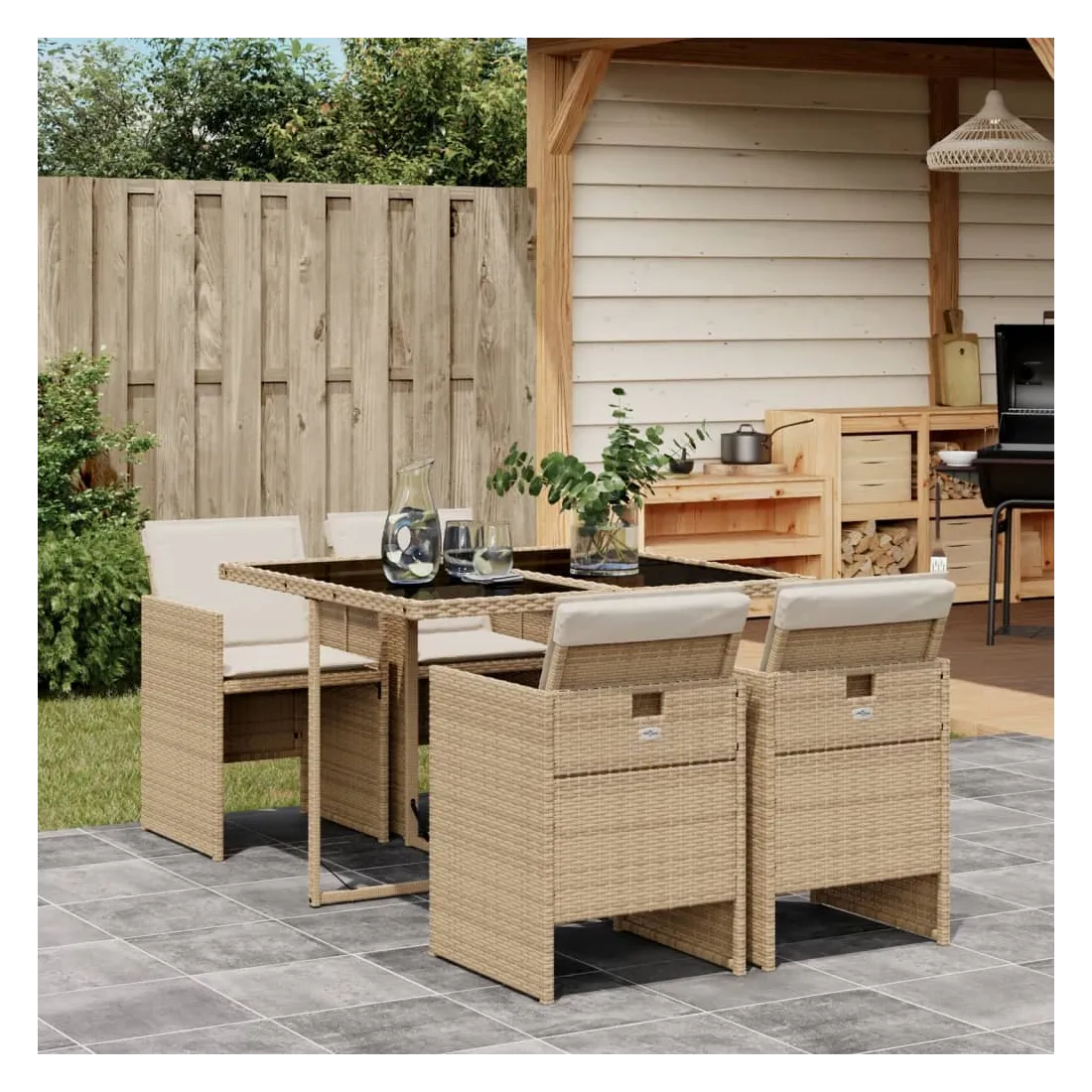 Cet ensemble de salle à manger de jardin est un excellent choix pour les repas en plein air ou pour vous détendre dans le jardin, dans l'arrière-cour ou sur la terrasse. Matériau durable : la résine tressée, également connue sous le nom de poly rotin, est un matériau synthétique solide et nécessitant peu d'entretien qui ressemble au rotin naturel. Il est léger, facile à nettoyer et couramment utilisé pour les meubles d'extérieur en raison de sa durabilité et de ses propriétés de résistance aux intempéries.Rangement compact : ces chaises sont dotées d'un dossier rabattable, ce qui permet de les ranger facilement sous la table. Une fois pliées, elles se rangent parfaitement sous la table, formant un cube peu encombrant. Expérience d'assise confortable : ce mobilier d'extérieur, doté de coussins épais, offre une expérience d'assise confortable.Housse amovible et lavable : ces coussins de siège sont dotés de housses amovibles pour un lavage et un entretien faciles.Dessus en verre : le dessus de la table d'extérieur est fabriqué en verre trempé solide et durable, ce qui le rend facile à nettoyer avec un chiffon humide et ajoute une touche d'élégance à votre espace extérieur. Bon à savoir : Pour que vos meubles d'extérieur restent beaux, nous vous recommandons de les protéger avec une housse imperméable.
