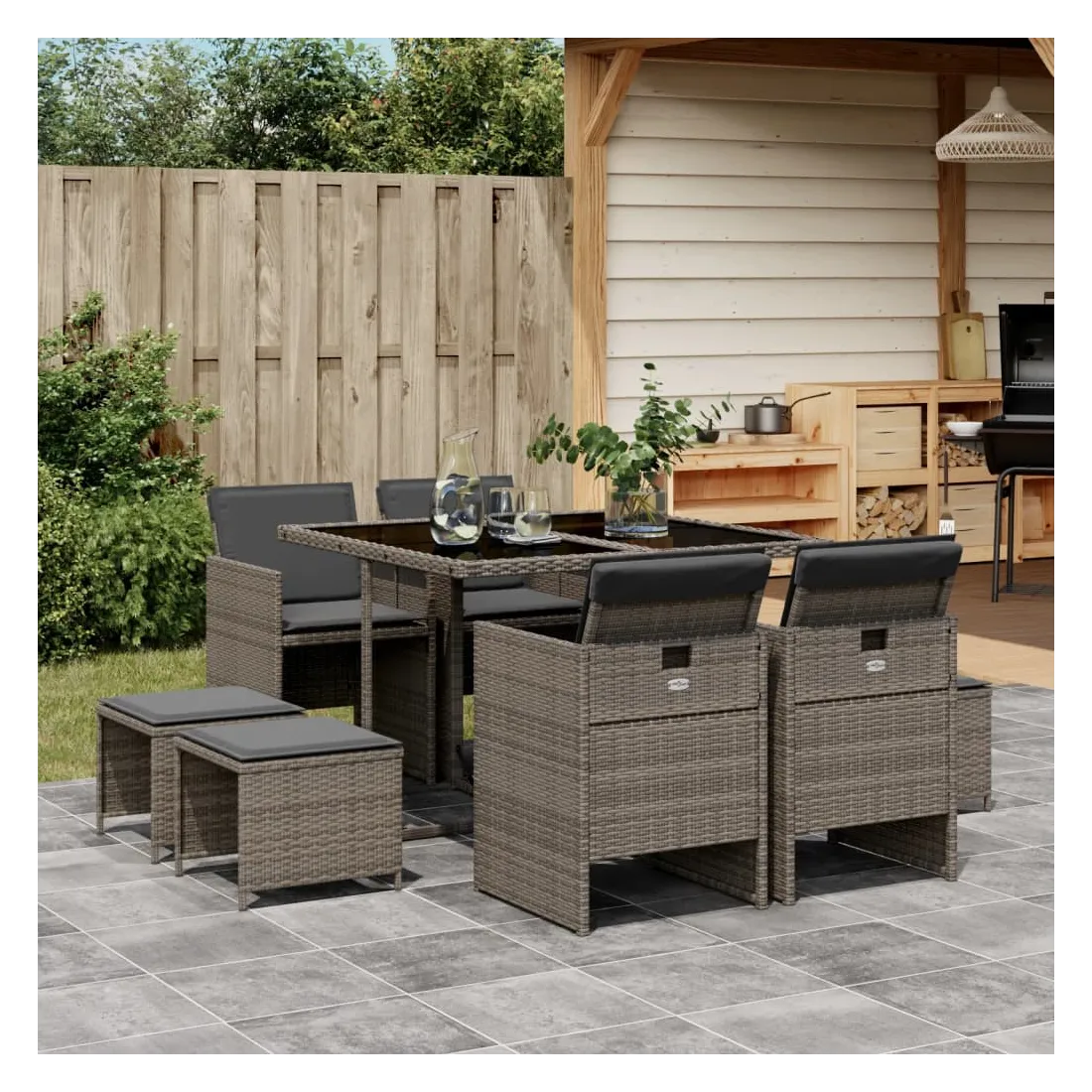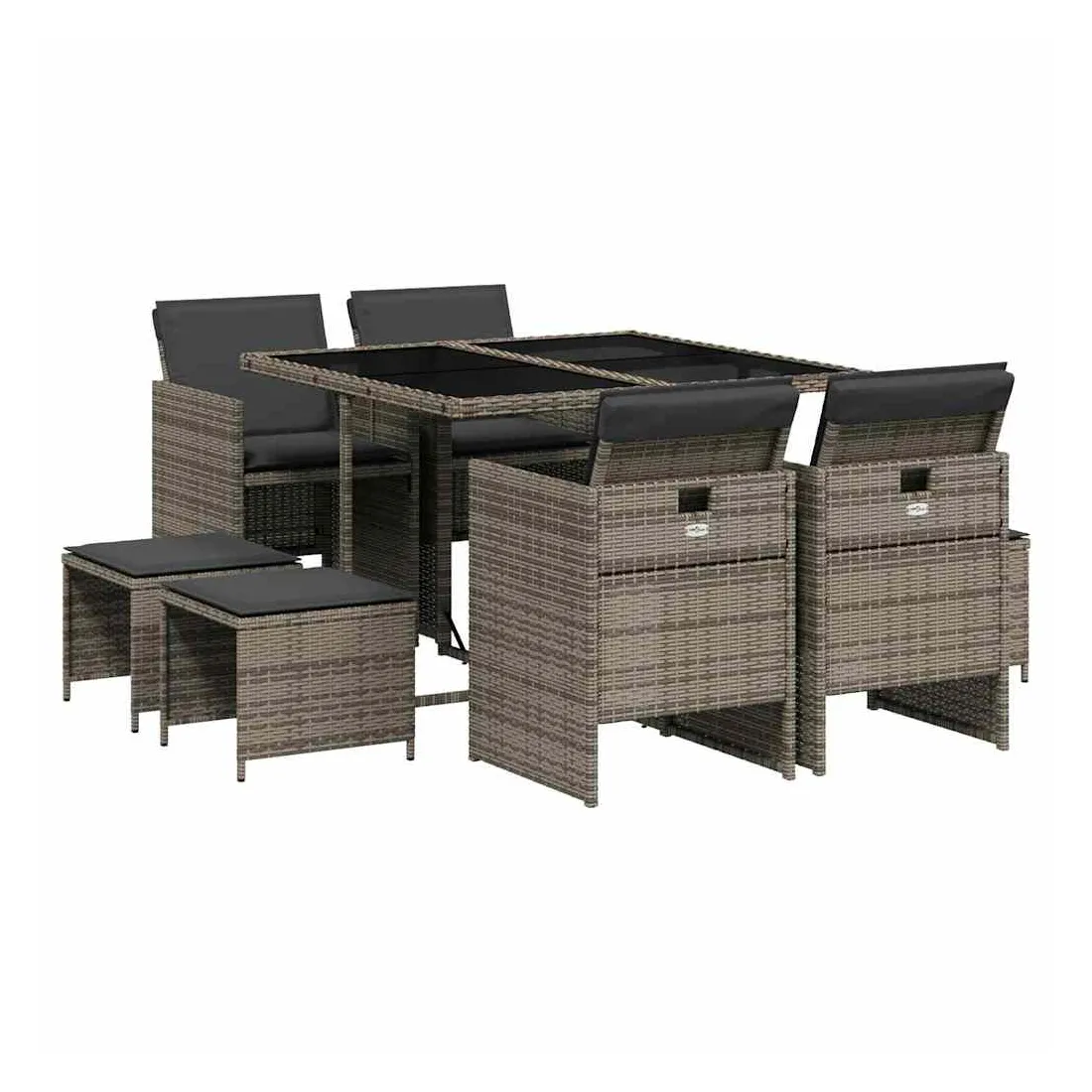 Cet ensemble de salle à manger de jardin est un excellent choix pour les repas en plein air ou pour vous détendre dans le jardin, dans l'arrière-cour ou sur la terrasse. Matériau durable : la résine tressée, également connue sous le nom de poly rotin, est un matériau synthétique solide et nécessitant peu d'entretien qui ressemble au rotin naturel. Il est léger, facile à nettoyer et couramment utilisé pour les meubles d'extérieur en raison de sa durabilité et de ses propriétés de résistance aux intempéries.Rangement compact : ces chaises sont dotées d'un dossier rabattable, ce qui permet de les ranger facilement sous la table. Une fois pliées, elles se rangent parfaitement sous la table, formant un cube peu encombrant. De plus, les tabourets peuvent également être rangés sous les chaises, maximisant encore davantage l'efficacité de l'espace. Expérience d'assise confortable : ce mobilier d'extérieur, doté de coussins épais, offre une expérience d'assise confortable.Housse amovible et lavable : ces coussins de siège sont dotés de housses amovibles pour un lavage et un entretien faciles.Dessus en verre : le dessus de la table d'extérieur est fabriqué en verre trempé solide et durable, ce qui le rend facile à nettoyer avec un chiffon humide et ajoute une touche d'élégance à votre espace extérieur. Bon à savoir : Pour que vos meubles d'extérieur restent beaux, nous vous recommandons de les protéger avec une housse imperméable.