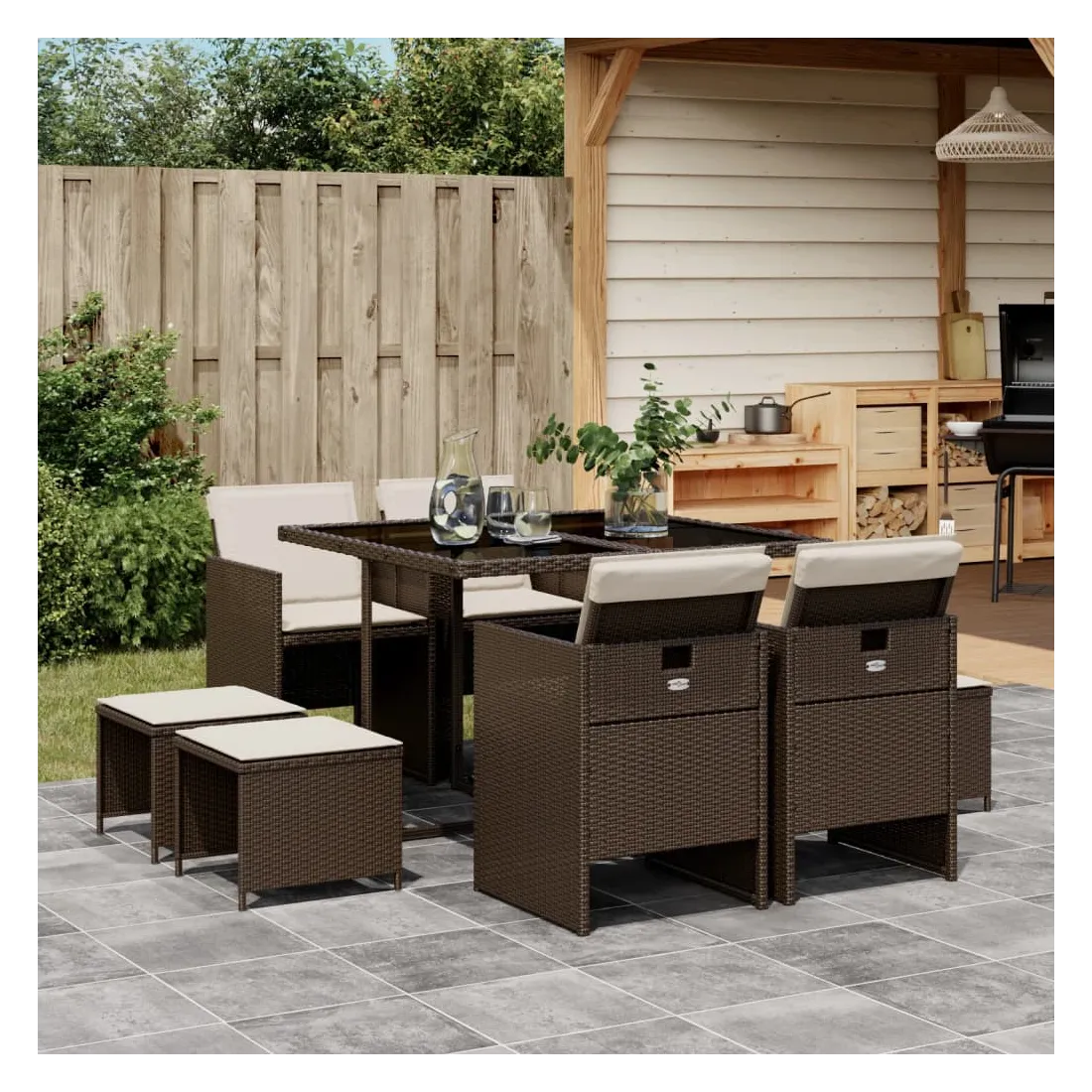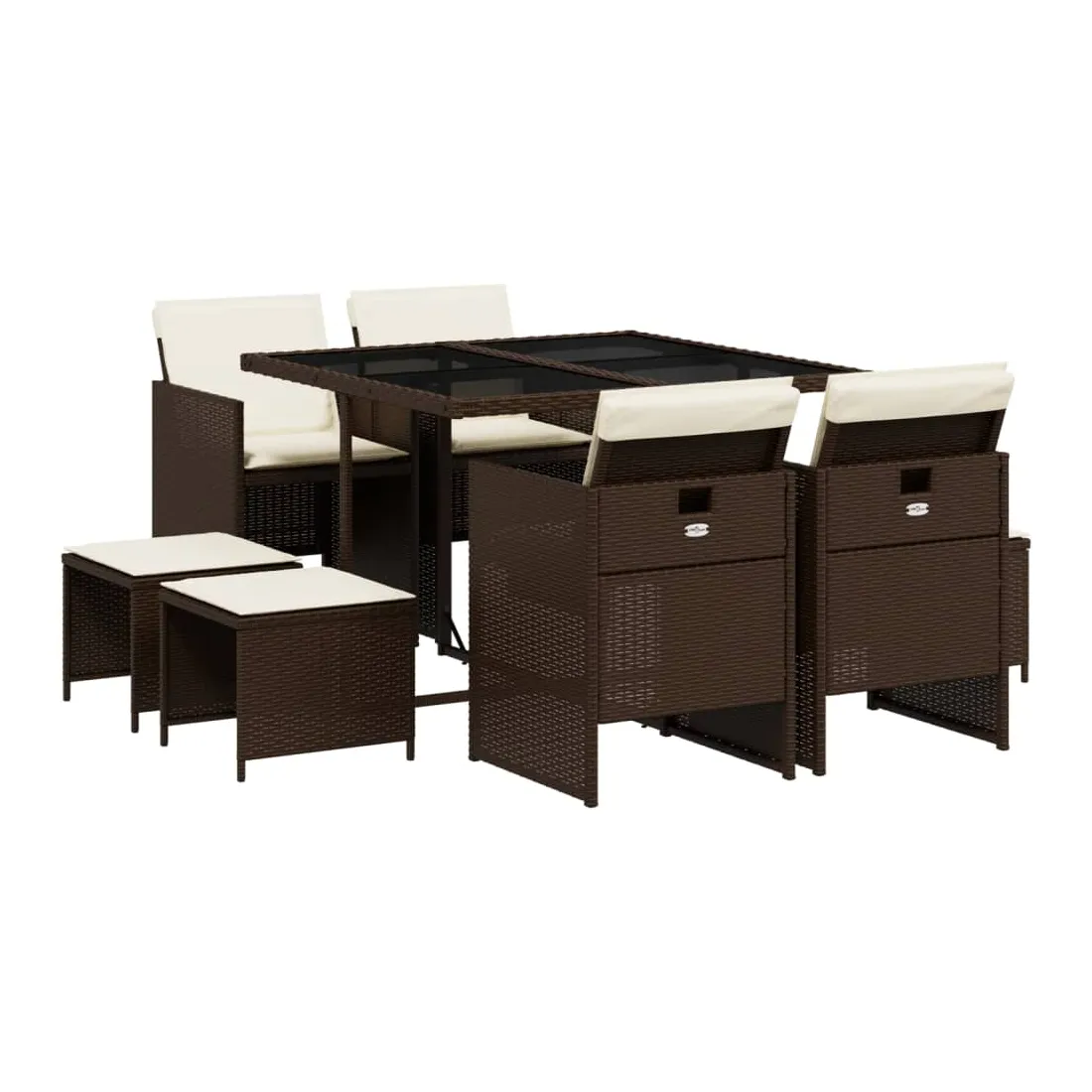 Cet ensemble de salle à manger de jardin est un excellent choix pour les repas en plein air ou pour vous détendre dans le jardin, dans l'arrière-cour ou sur la terrasse. Matériau durable : la résine tressée, également connue sous le nom de poly rotin, est un matériau synthétique solide et nécessitant peu d'entretien qui ressemble au rotin naturel. Il est léger, facile à nettoyer et couramment utilisé pour les meubles d'extérieur en raison de sa durabilité et de ses propriétés de résistance aux intempéries.Rangement compact : ces chaises sont dotées d'un dossier rabattable, ce qui permet de les ranger facilement sous la table. Une fois pliées, elles se rangent parfaitement sous la table, formant un cube peu encombrant. De plus, les tabourets peuvent également être rangés sous les chaises, maximisant encore davantage l'efficacité de l'espace. Expérience d'assise confortable : ce mobilier d'extérieur, doté de coussins épais, offre une expérience d'assise confortable.Housse amovible et lavable : ces coussins de siège sont dotés de housses amovibles pour un lavage et un entretien faciles.Dessus en verre : le dessus de la table d'extérieur est fabriqué en verre trempé solide et durable, ce qui le rend facile à nettoyer avec un chiffon humide et ajoute une touche d'élégance à votre espace extérieur. Bon à savoir : Pour que vos meubles d'extérieur restent beaux, nous vous recommandons de les protéger avec une housse imperméable.