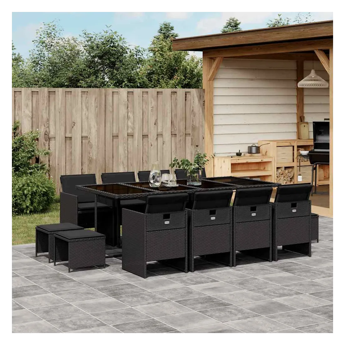 Cet ensemble de salle à manger de jardin est un excellent choix pour les repas en plein air ou pour vous détendre dans le jardin, dans l'arrière-cour ou sur la terrasse. Matériau durable : la résine tressée, également connue sous le nom de poly rotin, est un matériau synthétique solide et nécessitant peu d'entretien qui ressemble au rotin naturel. Il est léger, facile à nettoyer et couramment utilisé pour les meubles d'extérieur en raison de sa durabilité et de ses propriétés de résistance aux intempéries.Rangement compact : ces chaises sont dotées d'un dossier rabattable, ce qui permet de les ranger facilement sous la table. Une fois pliées, elles se rangent parfaitement sous la table, formant un cube peu encombrant. De plus, les tabourets peuvent également être rangés sous les chaises, maximisant encore davantage l'efficacité de l'espace. Expérience d'assise confortable : ce mobilier d'extérieur, doté de coussins épais, offre une expérience d'assise confortable.Housse amovible et lavable : ces coussins de siège sont dotés de housses amovibles pour un lavage et un entretien faciles.Dessus en verre : le dessus de la table d'extérieur est fabriqué en verre trempé solide et durable, ce qui le rend facile à nettoyer avec un chiffon humide et ajoute une touche d'élégance à votre espace extérieur. Bon à savoir : Pour que vos meubles d'extérieur restent beaux, nous vous recommandons de les protéger avec une housse imperméable.