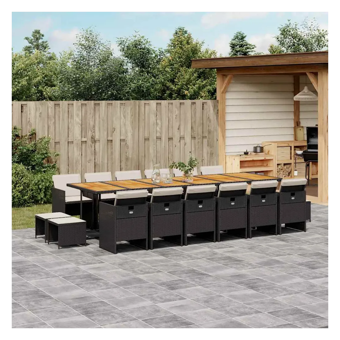 Cet ensemble de salle à manger de jardin est un excellent choix pour les repas en plein air ou pour vous détendre dans le jardin, dans l'arrière-cour ou sur la terrasse. Matériau durable : la résine tressée, également connue sous le nom de poly rotin, est un matériau synthétique solide et nécessitant peu d'entretien qui ressemble au rotin naturel. Il est léger, facile à nettoyer et couramment utilisé pour les meubles d'extérieur en raison de sa durabilité et de ses propriétés de résistance aux intempéries.Rangement compact : ces chaises sont dotées d'un dossier rabattable, ce qui permet de les ranger facilement sous la table. Une fois pliées, elles se rangent parfaitement sous la table, formant un cube peu encombrant. De plus, les tabourets peuvent également être rangés sous les chaises, maximisant encore davantage l'efficacité de l'espace. Expérience d'assise confortable : ce mobilier d'extérieur, doté de coussins épais, offre une expérience d'assise confortable.Housse amovible et lavable : ces coussins de siège sont dotés de housses amovibles pour un lavage et un entretien faciles.Dessus stable et facile à nettoyer : cette table de jardin a un dessus en bois d'acacia robuste, durable et facile à nettoyer avec un chiffon humide. Bon à savoir : Pour que vos meubles d'extérieur restent beaux, nous vous recommandons de les protéger avec une housse imperméable.