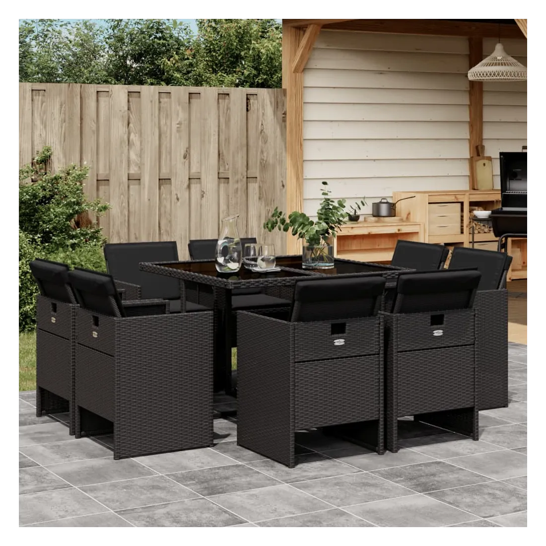 Cet ensemble de salle à manger de jardin est un excellent choix pour les repas en plein air ou pour vous détendre dans le jardin, dans l'arrière-cour ou sur la terrasse. Matériau durable : la résine tressée, également connue sous le nom de poly rotin, est un matériau synthétique solide et nécessitant peu d'entretien qui ressemble au rotin naturel. Il est léger, facile à nettoyer et couramment utilisé pour les meubles d'extérieur en raison de sa durabilité et de ses propriétés de résistance aux intempéries.Rangement compact : ces chaises sont dotées d'un dossier rabattable, ce qui permet de les ranger facilement sous la table. Une fois pliées, elles se rangent parfaitement sous la table, formant un cube peu encombrant. Expérience d'assise confortable : ce mobilier d'extérieur, doté de coussins épais, offre une expérience d'assise confortable.Housse amovible et lavable : ces coussins de siège sont dotés de housses amovibles pour un lavage et un entretien faciles.Dessus en verre : le dessus de la table d'extérieur est fabriqué en verre trempé solide et durable, ce qui le rend facile à nettoyer avec un chiffon humide et ajoute une touche d'élégance à votre espace extérieur. Bon à savoir : Pour que vos meubles d'extérieur restent beaux, nous vous recommandons de les protéger avec une housse imperméable.