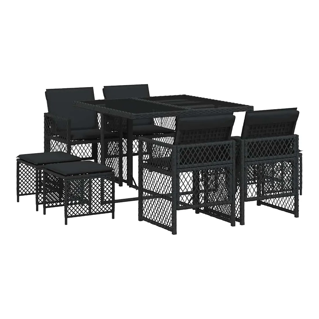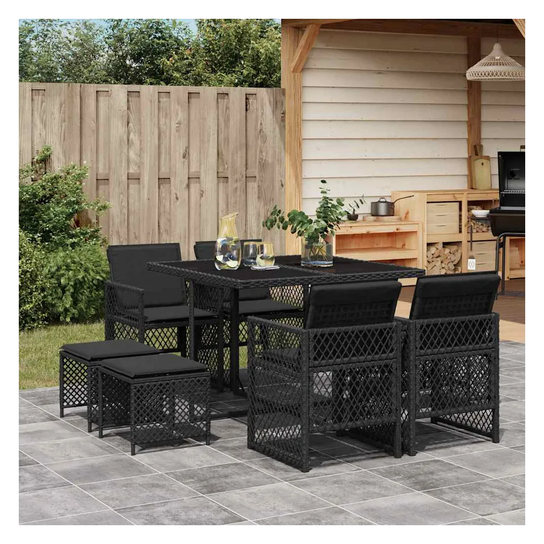Cet ensemble de salle à manger de jardin est un excellent choix pour les repas en plein air ou pour vous détendre dans le jardin, l'arrière-cour ou le patio. Matériau durable : la résine tressée, également connue sous le nom de poly rotin, est un matériau synthétique solide et nécessitant peu d'entretien qui ressemble au rotin naturel. Elle est légère, facile à nettoyer et couramment utilisée pour les meubles d'extérieur en raison de sa durabilité et de ses propriétés de résistance aux intempéries. Dessus en verre : le dessus de la table d'extérieur est fabriqué en verre trempé solide et durable, ce qui le rend facile à nettoyer avec un chiffon humide et ajoute une touche d'élégance à votre espace extérieur. Rangement compact : ces chaises sont dotées d'un dossier rabattable, ce qui permet de les ranger facilement sous la table. Une fois pliées, elles se rangent parfaitement sous la table, formant un cube peu encombrant. De plus, les tabourets peuvent également être rangés sous les chaises, maximisant encore davantage l'efficacité de l'espace. Expérience d'assise confortable : ce mobilier d'extérieur, doté de coussins épais, offre une expérience d'assise confortable. Housse amovible et lavable : ces coussins de siège sont dotés de housses amovibles pour un lavage et un entretien faciles. Les housses de coussin de chaise ont un rabat à l'arrière pour une fixation facile aux chaises. Bon à savoir :Pour que vos meubles d'extérieur restent beaux, nous vous recommandons de les protéger avec une housse imperméable.