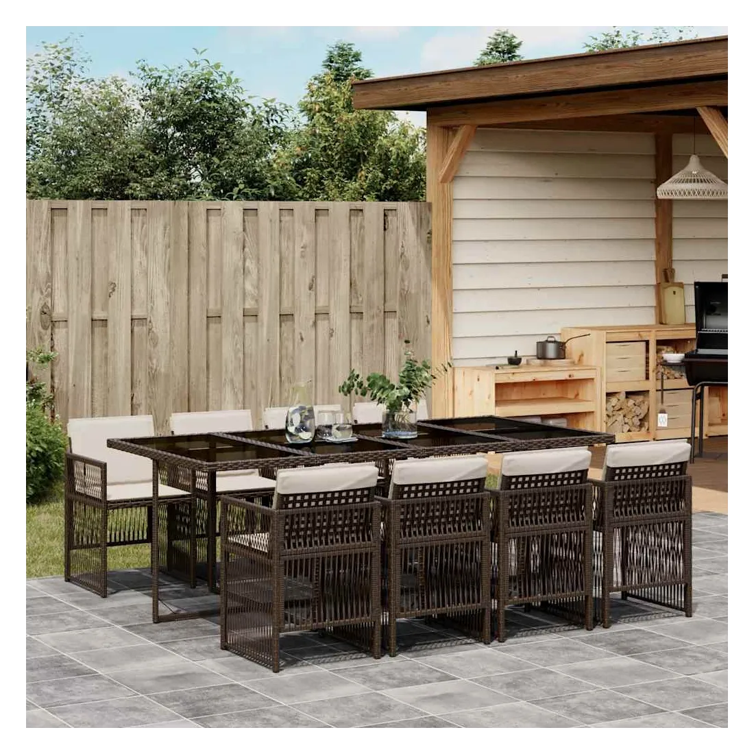 Cet ensemble de salle à manger de jardin est un excellent choix pour les repas en plein air ou pour vous détendre dans le jardin, dans l'arrière-cour ou sur la terrasse. Matériau durable : la résine tressée, également connue sous le nom de poly rotin, est un matériau synthétique solide et nécessitant peu d'entretien qui ressemble au rotin naturel. Il est léger, facile à nettoyer et couramment utilisé pour les meubles d'extérieur en raison de sa durabilité et de ses propriétés de résistance aux intempéries.Rangement compact : ces chaises sont dotées d'un dossier rabattable, ce qui permet de les ranger facilement sous la table. Une fois pliées, elles se rangent parfaitement sous la table, formant un cube peu encombrant.Expérience d'assise confortable : ce mobilier d'extérieur, doté de coussins épais, offre une expérience d'assise confortable.Housse amovible et lavable : ces coussins sont dotés de housses amovibles pour un lavage et un entretien faciles. Les housses de coussin ont un rabat à l'arrière pour une fixation facile aux dossiers.Dessus en verre : le dessus de la table d'extérieur est fabriqué en verre trempé solide et durable, ce qui le rend facile à nettoyer avec un chiffon humide et ajoute une touche d'élégance à votre espace extérieur. Bon à savoir : Pour que vos meubles d'extérieur restent beaux, nous vous recommandons de les protéger avec une housse imperméable.