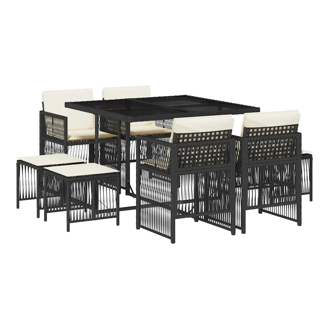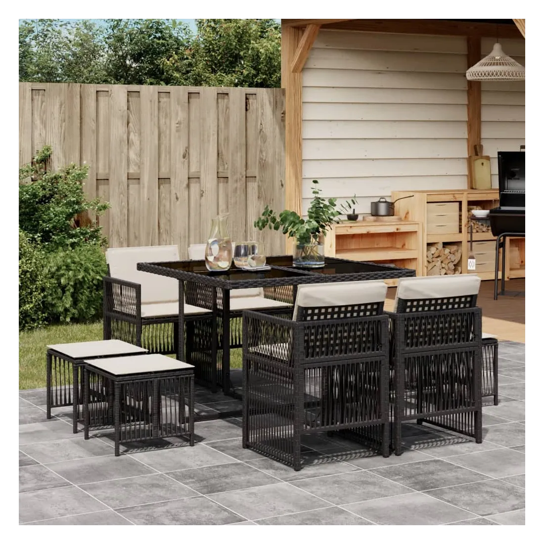 Cet ensemble de salle à manger de jardin est un excellent choix pour les repas en plein air ou pour vous détendre dans le jardin, dans l'arrière-cour ou sur la terrasse. Matériau durable : la résine tressée, également connue sous le nom de poly rotin, est un matériau synthétique solide et nécessitant peu d'entretien qui ressemble au rotin naturel. Il est léger, facile à nettoyer et couramment utilisé pour les meubles d'extérieur en raison de sa durabilité et de ses propriétés de résistance aux intempéries.Rangement compact : ces chaises sont dotées d'un dossier rabattable, ce qui permet de les ranger facilement sous la table. Une fois pliées, elles se rangent parfaitement sous la table, formant un cube peu encombrant. De plus, les tabourets peuvent également être rangés sous les chaises, maximisant encore davantage l'efficacité de l'espace.Expérience d'assise confortable : ce mobilier d'extérieur, doté de coussins épais, offre une expérience d'assise confortable.Housse amovible et lavable : ces coussins sont dotés de housses amovibles pour un lavage et un entretien faciles. Les housses de coussin ont un rabat à l'arrière pour une fixation facile aux dossiers.Dessus en verre : le dessus de la table d'extérieur est fabriqué en verre trempé solide et durable, ce qui le rend facile à nettoyer avec un chiffon humide et ajoute une touche d'élégance à votre espace extérieur. Bon à savoir : Pour que vos meubles d'extérieur restent beaux, nous vous recommandons de les protéger avec une housse imperméable.