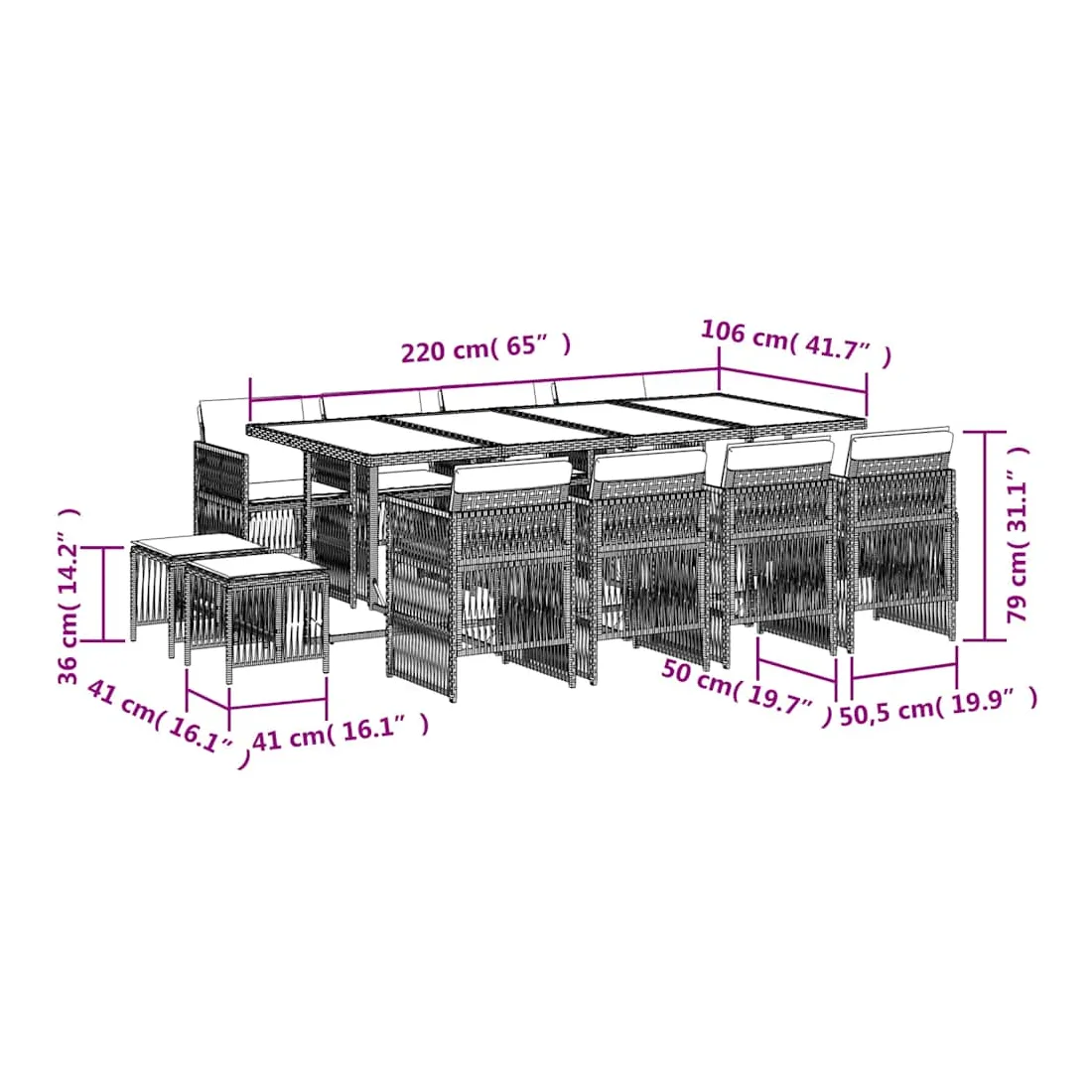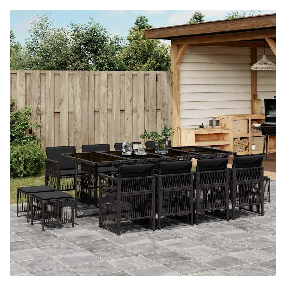 Cet ensemble de salle à manger de jardin est un excellent choix pour les repas en plein air ou pour vous détendre dans le jardin, dans l'arrière-cour ou sur la terrasse. Matériau durable : la résine tressée, également connue sous le nom de poly rotin, est un matériau synthétique solide et nécessitant peu d'entretien qui ressemble au rotin naturel. Il est léger, facile à nettoyer et couramment utilisé pour les meubles d'extérieur en raison de sa durabilité et de ses propriétés de résistance aux intempéries.Rangement compact : ces chaises sont dotées d'un dossier rabattable, ce qui permet de les ranger facilement sous la table. Une fois pliées, elles se rangent parfaitement sous la table, formant un cube peu encombrant. De plus, les tabourets peuvent également être rangés sous les chaises, maximisant encore davantage l'efficacité de l'espace.Expérience d'assise confortable : ce mobilier d'extérieur, doté de coussins épais, offre une expérience d'assise confortable.Housse amovible et lavable : ces coussins sont dotés de housses amovibles pour un lavage et un entretien faciles. Les housses de coussin ont un rabat à l'arrière pour une fixation facile aux dossiers.Dessus en verre : le dessus de la table d'extérieur est fabriqué en verre trempé solide et durable, ce qui le rend facile à nettoyer avec un chiffon humide et ajoute une touche d'élégance à votre espace extérieur. Bon à savoir : Pour que vos meubles d'extérieur restent beaux, nous vous recommandons de les protéger avec une housse imperméable.
