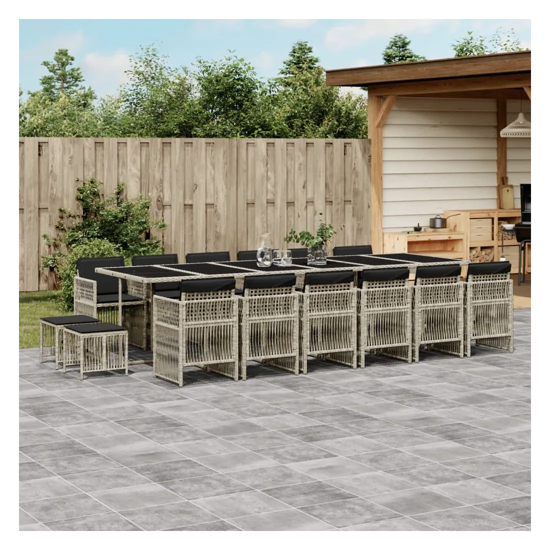 Cet ensemble de salle à manger de jardin est un excellent choix pour les repas en plein air ou pour vous détendre dans le jardin, dans l'arrière-cour ou sur la terrasse. Matériau durable : la résine tressée, également connue sous le nom de poly rotin, est un matériau synthétique solide et nécessitant peu d'entretien qui ressemble au rotin naturel. Il est léger, facile à nettoyer et couramment utilisé pour les meubles d'extérieur en raison de sa durabilité et de ses propriétés de résistance aux intempéries.Rangement compact : ces chaises sont dotées d'un dossier rabattable, ce qui permet de les ranger facilement sous la table. Une fois pliées, elles se rangent parfaitement sous la table, formant un cube peu encombrant. De plus, les tabourets peuvent également être rangés sous les chaises, maximisant encore davantage l'efficacité de l'espace.Expérience d'assise confortable : ce mobilier d'extérieur, doté de coussins épais, offre une expérience d'assise confortable.Housse amovible et lavable : ces coussins sont dotés de housses amovibles pour un lavage et un entretien faciles. Les housses de coussin ont un rabat à l'arrière pour une fixation facile aux dossiers.Dessus en verre : le dessus de la table d'extérieur est fabriqué en verre trempé solide et durable, ce qui le rend facile à nettoyer avec un chiffon humide et ajoute une touche d'élégance à votre espace extérieur. Bon à savoir : Pour que vos meubles d'extérieur restent beaux, nous vous recommandons de les protéger avec une housse imperméable.