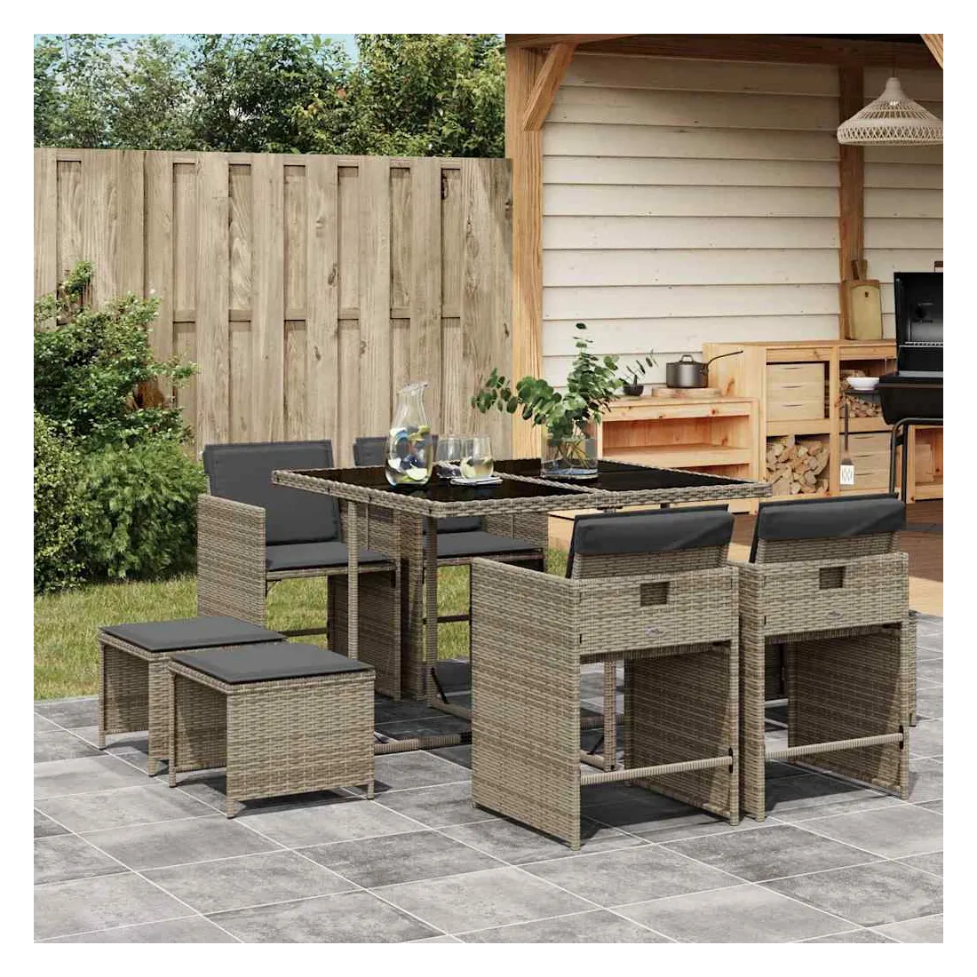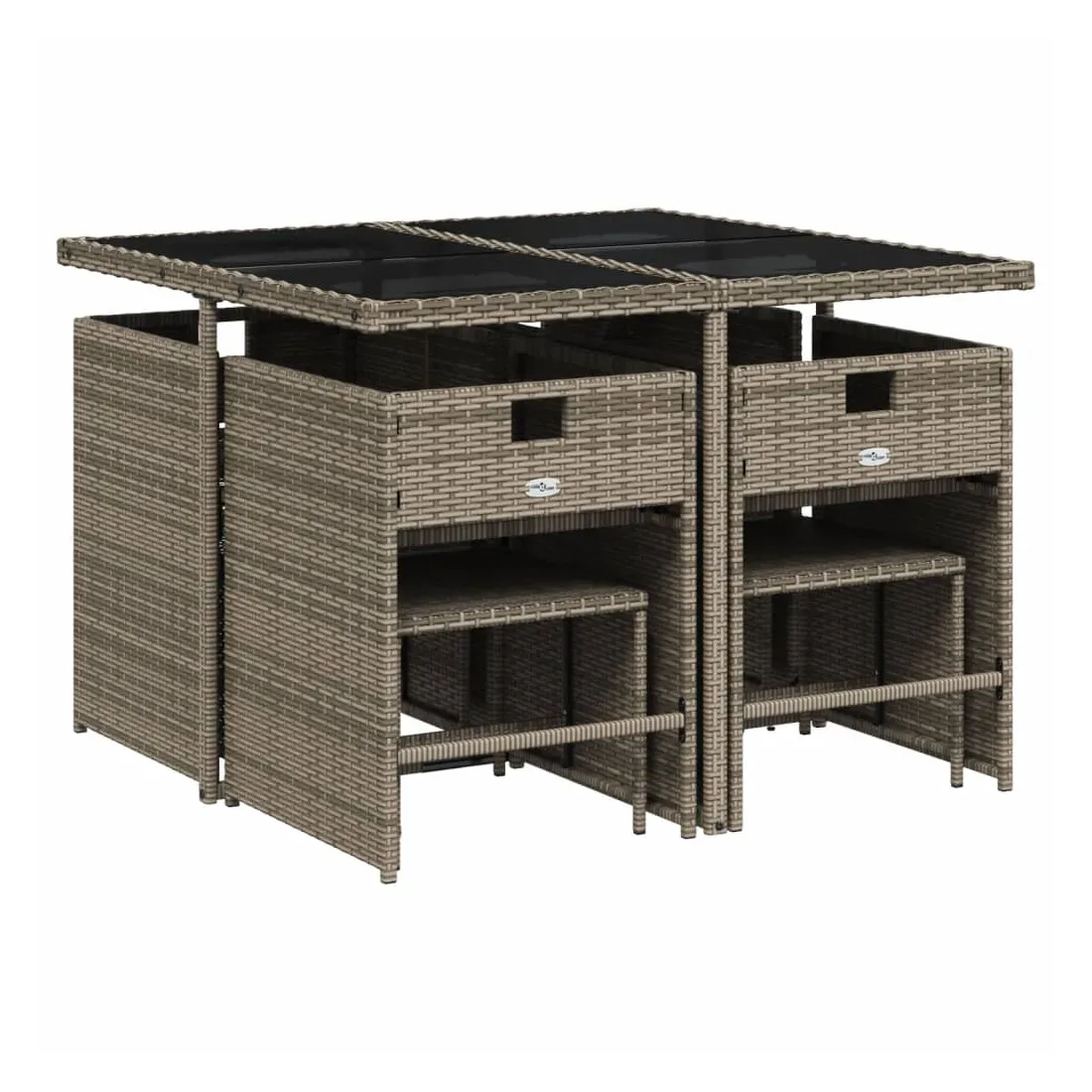 Cet ensemble de salle à manger de jardin est un excellent choix pour les repas en plein air ou pour vous détendre dans le jardin, dans l'arrière-cour ou sur la terrasse. Matériau durable : la résine tressée, également connue sous le nom de poly rotin, est un matériau synthétique solide et nécessitant peu d'entretien qui ressemble au rotin naturel. Il est léger, facile à nettoyer et couramment utilisé pour les meubles d'extérieur en raison de sa durabilité et de ses propriétés de résistance aux intempéries.Rangement compact : ces chaises sont dotées d'un dossier rabattable, ce qui permet de les ranger facilement sous la table. Une fois pliées, elles se rangent parfaitement sous la table, formant un cube peu encombrant. De plus, les tabourets peuvent également être rangés sous les chaises, maximisant encore davantage l'efficacité de l'espace.Expérience d'assise confortable : ce mobilier d'extérieur, doté de coussins épais, offre une expérience d'assise confortable.Housse amovible et lavable : ces coussins de siège sont dotés de housses amovibles pour un lavage et un entretien faciles. Les housses de coussin de chaise ont un rabat à l'arrière pour une fixation facile aux chaises.Dessus stable et facile à nettoyer : cette table de jardin est dotée d'un dessus en verre trempé robuste, durable et facile à nettoyer à l'aide d'un chiffon humide. Bon à savoir : Pour que vos meubles d'extérieur restent beaux, nous vous recommandons de les protéger avec une housse imperméable.