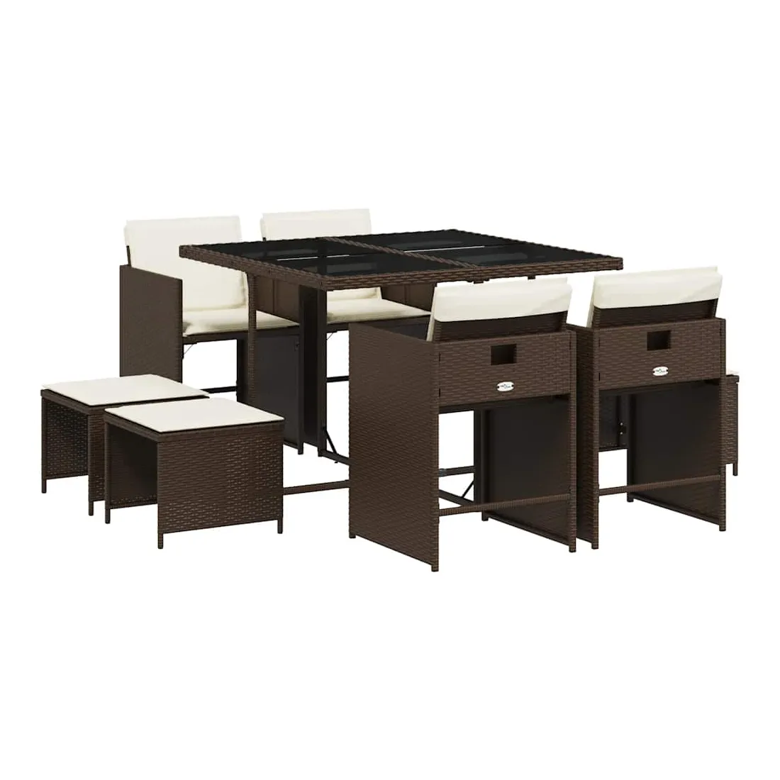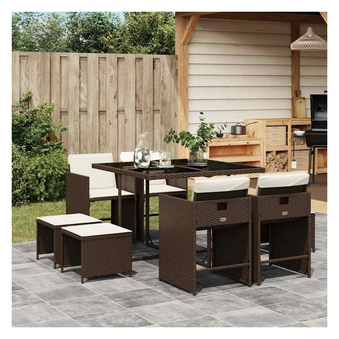 Cet ensemble de salle à manger de jardin est un excellent choix pour les repas en plein air ou pour vous détendre dans le jardin, dans l'arrière-cour ou sur la terrasse. Matériau durable : la résine tressée, également connue sous le nom de poly rotin, est un matériau synthétique solide et nécessitant peu d'entretien qui ressemble au rotin naturel. Il est léger, facile à nettoyer et couramment utilisé pour les meubles d'extérieur en raison de sa durabilité et de ses propriétés de résistance aux intempéries.Rangement compact : ces chaises sont dotées d'un dossier rabattable, ce qui permet de les ranger facilement sous la table. Une fois pliées, elles se rangent parfaitement sous la table, formant un cube peu encombrant. De plus, les tabourets peuvent également être rangés sous les chaises, maximisant encore davantage l'efficacité de l'espace.Expérience d'assise confortable : ce mobilier d'extérieur, doté de coussins épais, offre une expérience d'assise confortable.Housse amovible et lavable : ces coussins de siège sont dotés de housses amovibles pour un lavage et un entretien faciles. Les housses de coussin de chaise ont un rabat à l'arrière pour une fixation facile aux chaises.Dessus stable et facile à nettoyer : cette table de jardin est dotée d'un dessus en verre trempé robuste, durable et facile à nettoyer à l'aide d'un chiffon humide. Bon à savoir : Pour que vos meubles d'extérieur restent beaux, nous vous recommandons de les protéger avec une housse imperméable.