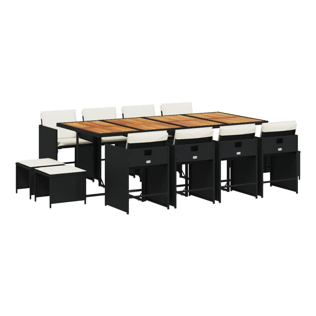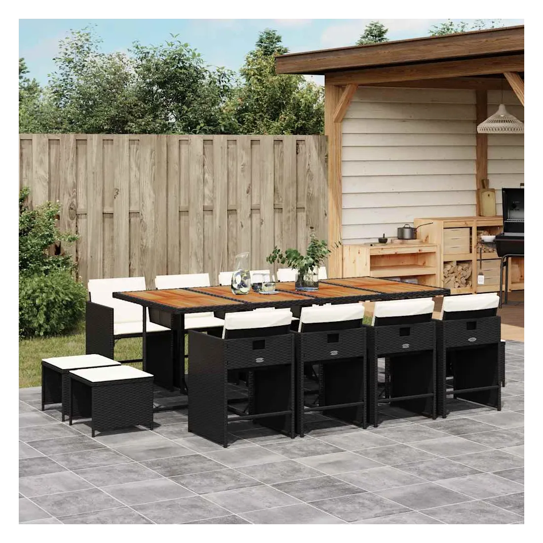 vidaXLCet ensemble de salle à manger de jardin est un excellent choix pour les repas en plein air ou pour vous détendre dans le jardin, dans l'arrière-cour ou sur la terrasse. Matériau durable : la résine tressée, également connue sous le nom de poly rotin, est un matériau synthétique solide et nécessitant peu d'entretien qui ressemble au rotin naturel. Il est léger, facile à nettoyer et couramment utilisé pour les meubles d'extérieur en raison de sa durabilité et de ses propriétés de résistance aux intempéries.Rangement compact : ces chaises sont dotées d'un dossier rabattable, ce qui permet de les ranger facilement sous la table. Une fois pliées, elles se rangent parfaitement sous la table, formant un cube peu encombrant. De plus, les tabourets peuvent également être rangés sous les chaises, maximisant encore davantage l'efficacité de l'espace.Expérience d'assise confortable : ce mobilier d'extérieur, doté de coussins épais, offre une expérience d'assise confortable.Housse amovible et lavable : ces coussins de siège sont dotés de housses amovibles pour un lavage et un entretien faciles. Les housses de coussin de chaise ont un rabat à l'arrière pour une fixation facile aux chaises.Dessus stable et facile à nettoyer : cette table de jardin a un dessus en bois d'acacia robuste, durable et facile à nettoyer avec un chiffon humide. Bon à savoir : Pour que vos meubles d'extérieur restent beaux, nous vous recommandons de les protéger avec une housse imperméable.