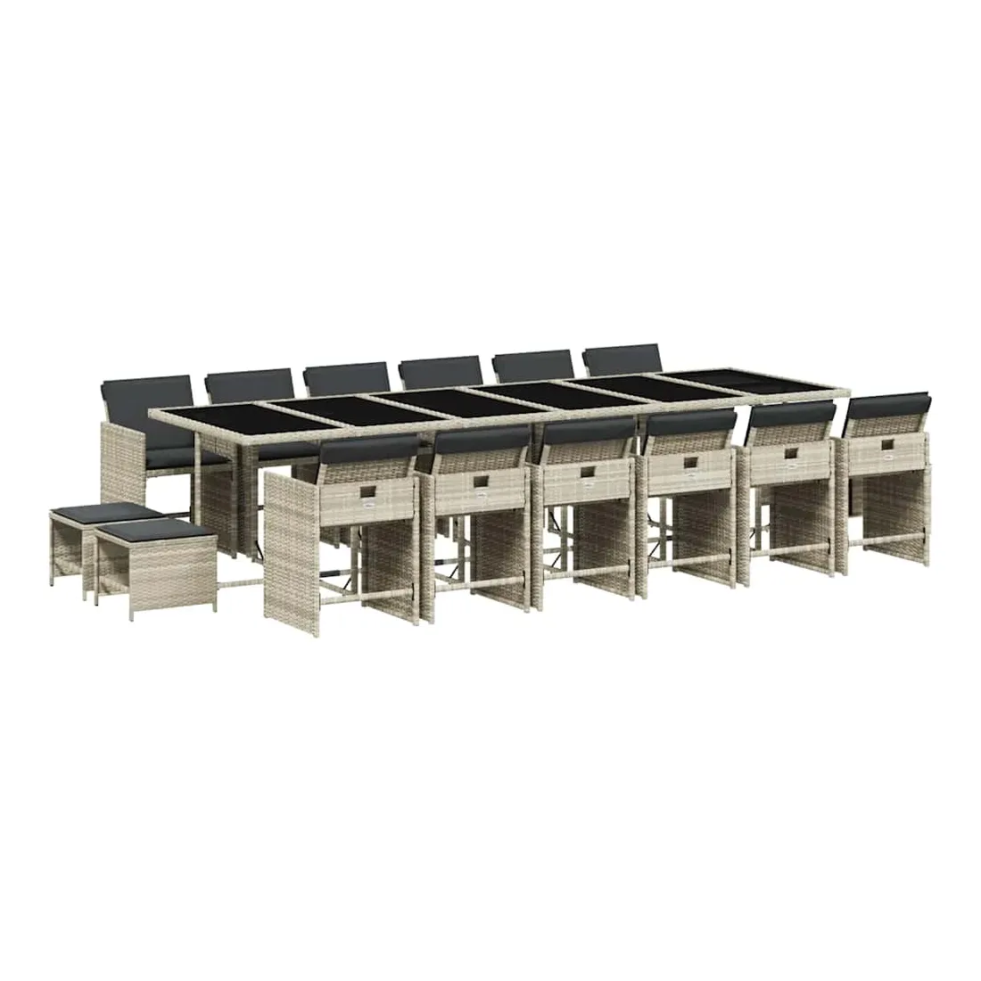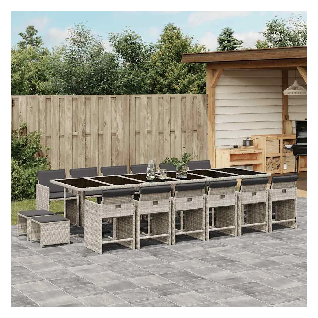 Cet ensemble de salle à manger de jardin est un excellent choix pour les repas en plein air ou pour vous détendre dans le jardin, dans l'arrière-cour ou sur la terrasse. Matériau durable : la résine tressée, également connue sous le nom de poly rotin, est un matériau synthétique solide et nécessitant peu d'entretien qui ressemble au rotin naturel. Il est léger, facile à nettoyer et couramment utilisé pour les meubles d'extérieur en raison de sa durabilité et de ses propriétés de résistance aux intempéries.Rangement compact : ces chaises sont dotées d'un dossier rabattable, ce qui permet de les ranger facilement sous la table. Une fois pliées, elles se rangent parfaitement sous la table, formant un cube peu encombrant. De plus, les tabourets peuvent également être rangés sous les chaises, maximisant encore davantage l'efficacité de l'espace.Expérience d'assise confortable : ce mobilier d'extérieur, doté de coussins épais, offre une expérience d'assise confortable.Housse amovible et lavable : ces coussins de siège sont dotés de housses amovibles pour un lavage et un entretien faciles. Les housses de coussin de chaise ont un rabat à l'arrière pour une fixation facile aux chaises.Dessus stable et facile à nettoyer : cette table de jardin est dotée d'un dessus en verre trempé robuste, durable et facile à nettoyer à l'aide d'un chiffon humide. Bon à savoir : Pour que vos meubles d'extérieur restent beaux, nous vous recommandons de les protéger avec une housse imperméable.