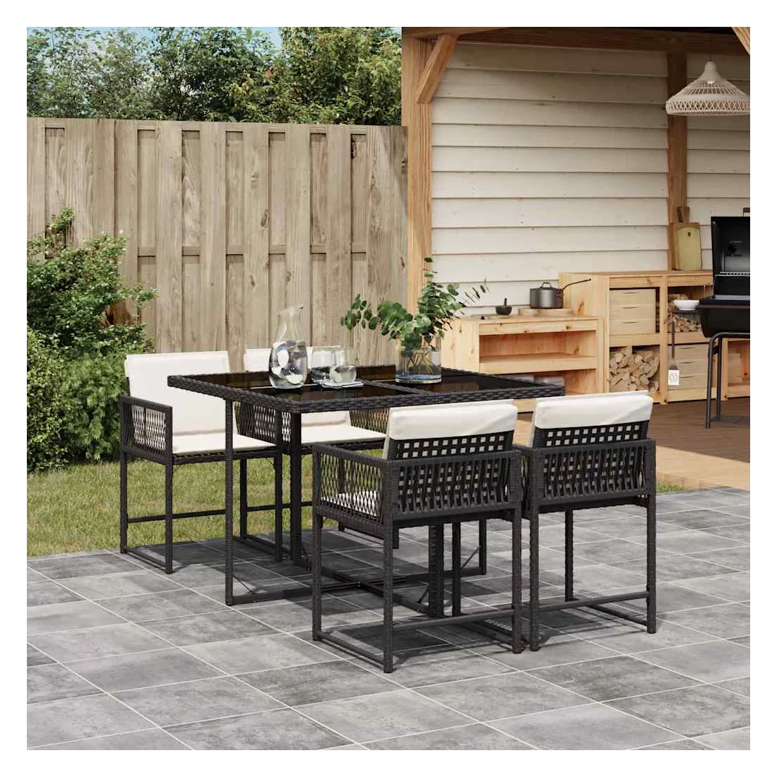 Cet ensemble de salle à manger de jardin est un excellent choix pour les repas en plein air ou pour vous détendre dans le jardin, dans l'arrière-cour ou sur la terrasse. Matériau durable : la résine tressée, également connue sous le nom de poly rotin, est un matériau synthétique solide et nécessitant peu d'entretien qui ressemble au rotin naturel. Il est léger, facile à nettoyer et couramment utilisé pour les meubles d'extérieur en raison de sa durabilité et de ses propriétés de résistance aux intempéries.Rangement compact : ces chaises sont dotées d'un dossier rabattable, ce qui permet de les ranger facilement sous la table. Une fois pliées, elles se rangent parfaitement sous la table, formant un cube peu encombrant.Expérience d'assise confortable : ce mobilier d'extérieur, doté de coussins épais, offre une expérience d'assise confortable.Housse amovible et lavable : ces coussins de siège sont dotés de housses amovibles pour un lavage et un entretien faciles. Les housses de coussin ont un rabat à l'arrière pour une fixation facile aux dossiers.Dessus en verre : le dessus de la table d'extérieur est fabriqué en verre trempé solide et durable, ce qui le rend facile à nettoyer avec un chiffon humide et ajoute une touche d'élégance à votre espace extérieur. Bon à savoir :Pour que vos meubles d'extérieur restent beaux, nous vous recommandons de les protéger avec une housse imperméable.