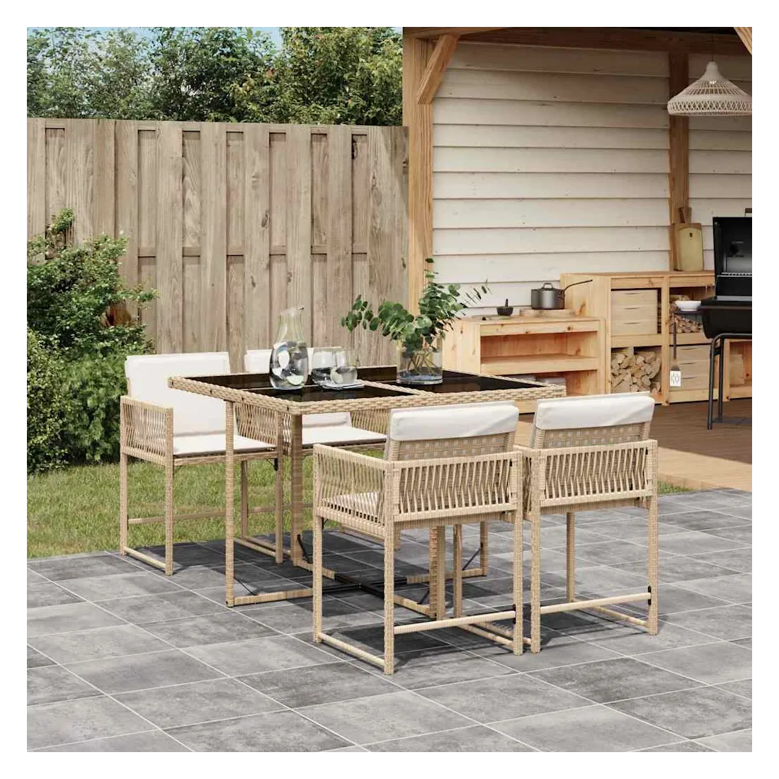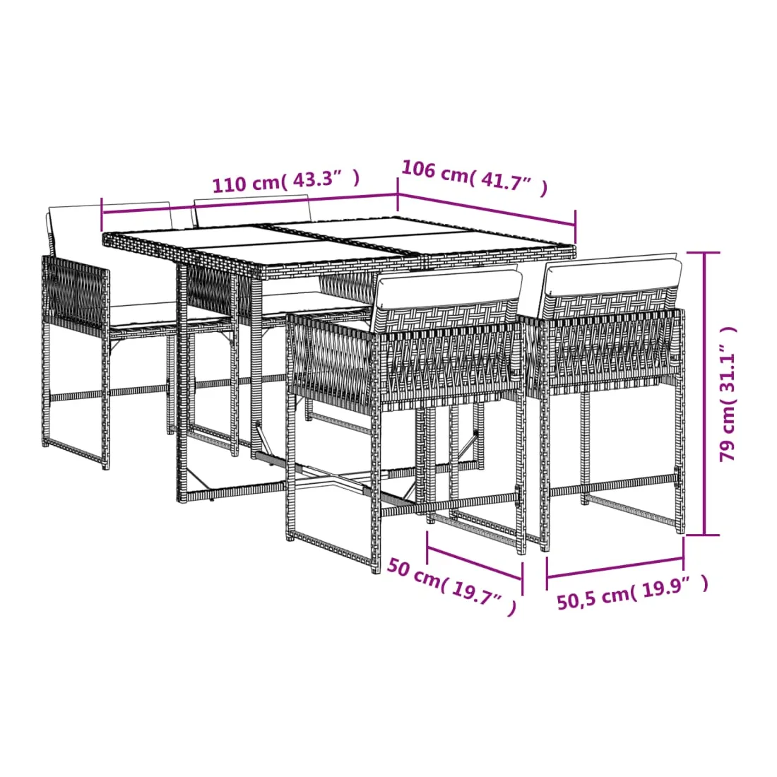Cet ensemble de salle à manger de jardin est un excellent choix pour les repas en plein air ou pour vous détendre dans le jardin, dans l'arrière-cour ou sur la terrasse. Matériau durable : la résine tressée, également connue sous le nom de poly rotin, est un matériau synthétique solide et nécessitant peu d'entretien qui ressemble au rotin naturel. Il est léger, facile à nettoyer et couramment utilisé pour les meubles d'extérieur en raison de sa durabilité et de ses propriétés de résistance aux intempéries.Rangement compact : ces chaises sont dotées d'un dossier rabattable, ce qui permet de les ranger facilement sous la table. Une fois pliées, elles se rangent parfaitement sous la table, formant un cube peu encombrant.Expérience d'assise confortable : ce mobilier d'extérieur, doté de coussins épais, offre une expérience d'assise confortable.Housse amovible et lavable : ces coussins de siège sont dotés de housses amovibles pour un lavage et un entretien faciles. Les housses de coussin ont un rabat à l'arrière pour une fixation facile aux dossiers.Dessus en verre : le dessus de la table d'extérieur est fabriqué en verre trempé solide et durable, ce qui le rend facile à nettoyer avec un chiffon humide et ajoute une touche d'élégance à votre espace extérieur. Bon à savoir :Pour que vos meubles d'extérieur restent beaux, nous vous recommandons de les protéger avec une housse imperméable.