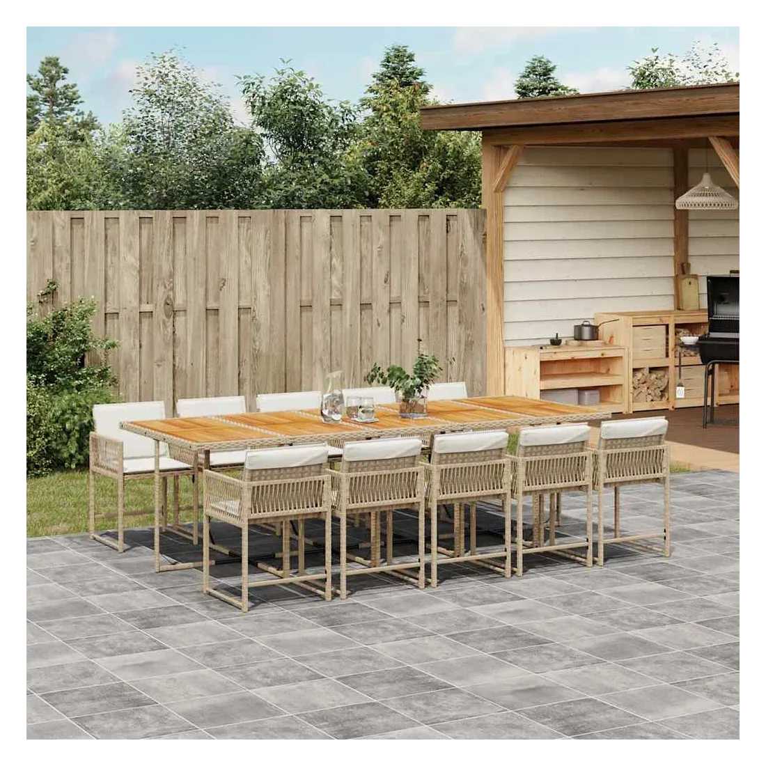 Cet ensemble de salle à manger de jardin est un excellent choix pour les repas en plein air ou pour vous détendre dans le jardin, dans l'arrière-cour ou sur la terrasse. Matériau durable : la résine tressée, également connue sous le nom de poly rotin, est un matériau synthétique solide et nécessitant peu d'entretien qui ressemble au rotin naturel. Il est léger, facile à nettoyer et couramment utilisé pour les meubles d'extérieur en raison de sa durabilité et de ses propriétés de résistance aux intempéries.Rangement compact : ces chaises sont dotées d'un dossier rabattable, ce qui permet de les ranger facilement sous la table. Une fois pliées, elles se rangent parfaitement sous la table, formant un cube peu encombrant.Expérience d'assise confortable : ce mobilier d'extérieur, doté de coussins épais, offre une expérience d'assise confortable.Housse amovible et lavable : ces coussins de siège sont dotés de housses amovibles pour un lavage et un entretien faciles. Les housses de coussin ont un rabat à l'arrière pour une fixation facile aux dossiers.Dessus stable et facile à nettoyer : cette table de jardin a un dessus en bois d'acacia robuste, durable et facile à nettoyer avec un chiffon humide. Bon à savoir :Pour que vos meubles d'extérieur restent beaux, nous vous recommandons de les protéger avec une housse imperméable.