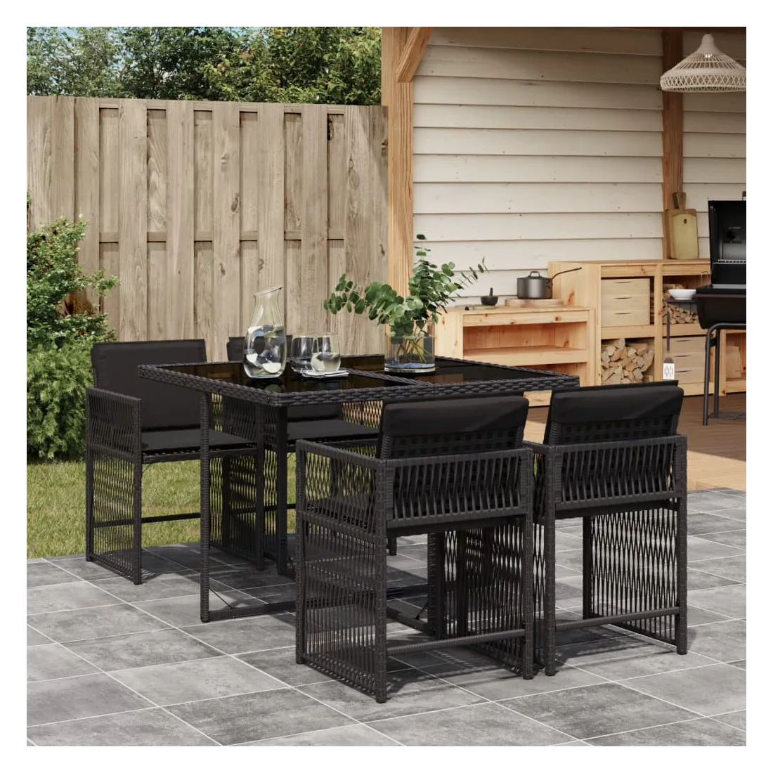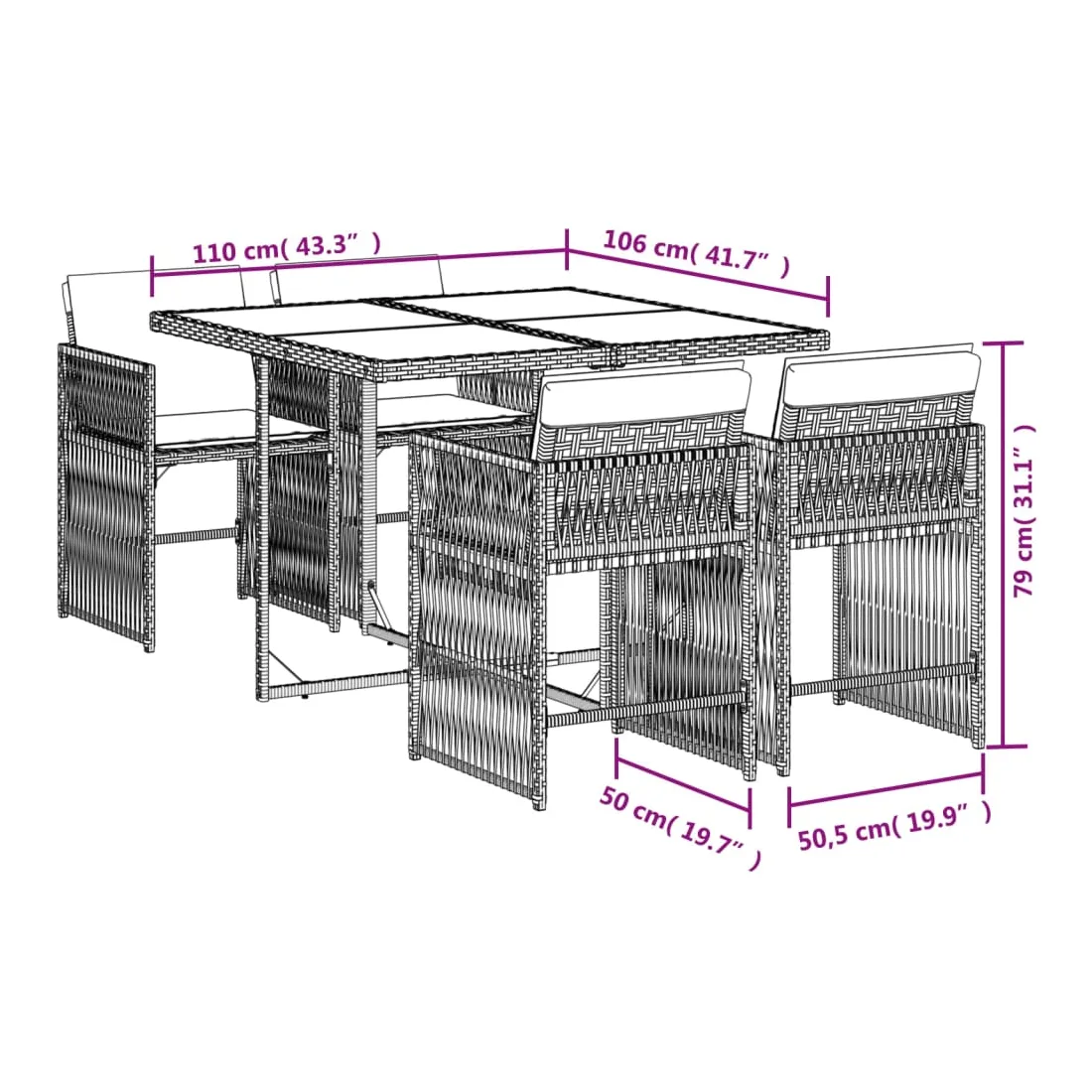 Cet ensemble de salle à manger de jardin est un excellent choix pour les repas en plein air ou pour vous détendre dans le jardin, l'arrière-cour ou le patio. Matériau durable : la résine tressée, également connue sous le nom de poly rotin, est un matériau synthétique solide et nécessitant peu d'entretien qui ressemble au rotin naturel. Il est léger, facile à nettoyer et couramment utilisé pour les meubles d'extérieur en raison de sa durabilité et de ses propriétés de résistance aux intempéries.Rangement compact : ces chaises sont dotées d'un dossier rabattable, ce qui permet de les ranger facilement sous la table. Une fois pliées, elles se rangent parfaitement sous la table, formant un cube peu encombrant.Expérience d'assise confortable : ce mobilier d'extérieur, doté de coussins épais, offre une expérience d'assise confortable.Housse amovible et lavable : ces coussins de siège sont dotés de housses amovibles pour un lavage et un entretien faciles. Les housses de coussin ont un rabat à l'arrière pour une fixation facile aux dossiers.Dessus en verre : le dessus de la table d'extérieur est fabriqué en verre trempé solide et durable, ce qui le rend facile à nettoyer avec un chiffon humide et ajoute une touche d'élégance à votre espace extérieur. Bon à savoir :Pour que vos meubles d'extérieur restent beaux, nous vous recommandons de les protéger avec une housse imperméable.