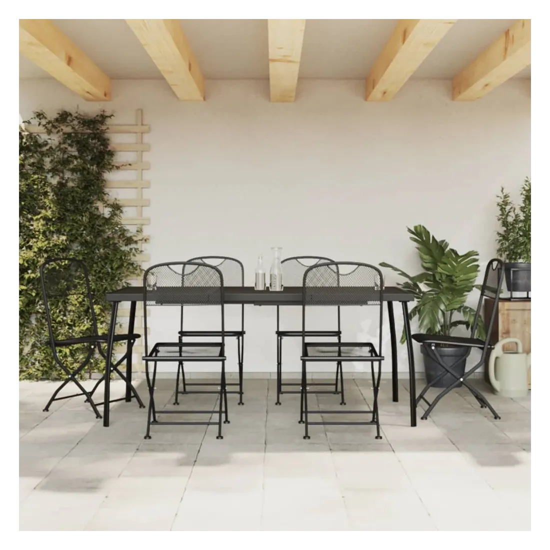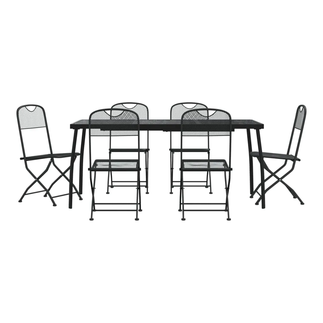 Profitez d'un bon repas ou d'un thé l'après-midi dans votre espace extérieur avec cet ensemble de salle à manger de jardin ! Ayant un design élégant, il deviendra le point central de votre jardin et de votre terrasse ! Cadre robuste : le cadre en métal rend cet ensemble de meubles de jardin robuste et durable, offrant un service à vie.Conception en maille : cet ensemble de salle à manger, avec son design en maille, peut efficacement éviter l'accumulation d'eau, ajoutant une apparence élégante à votre espace de vie extérieur.Dessus de table pratique : le dessus robuste de la table de jardin est parfait pour placer les repas, les boissons et d'autres objets décoratifs.Facile à déplacer : ces chaises à manger de jardin sont pliables pour gagner de la place lorsqu'elles ne sont pas utilisées. Vous pouvez facilement les transporter avec vous lors de vos sorties en plein air. Bon à savoir :Pour que vos meubles d'extérieur restent beaux, nous vous recommandons de les protéger avec une housse imperméable.
