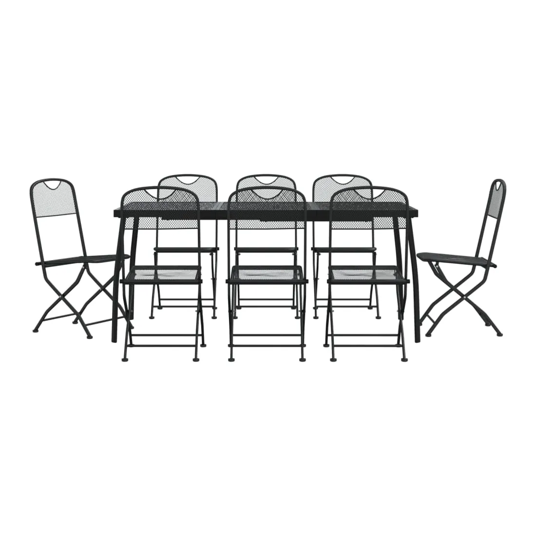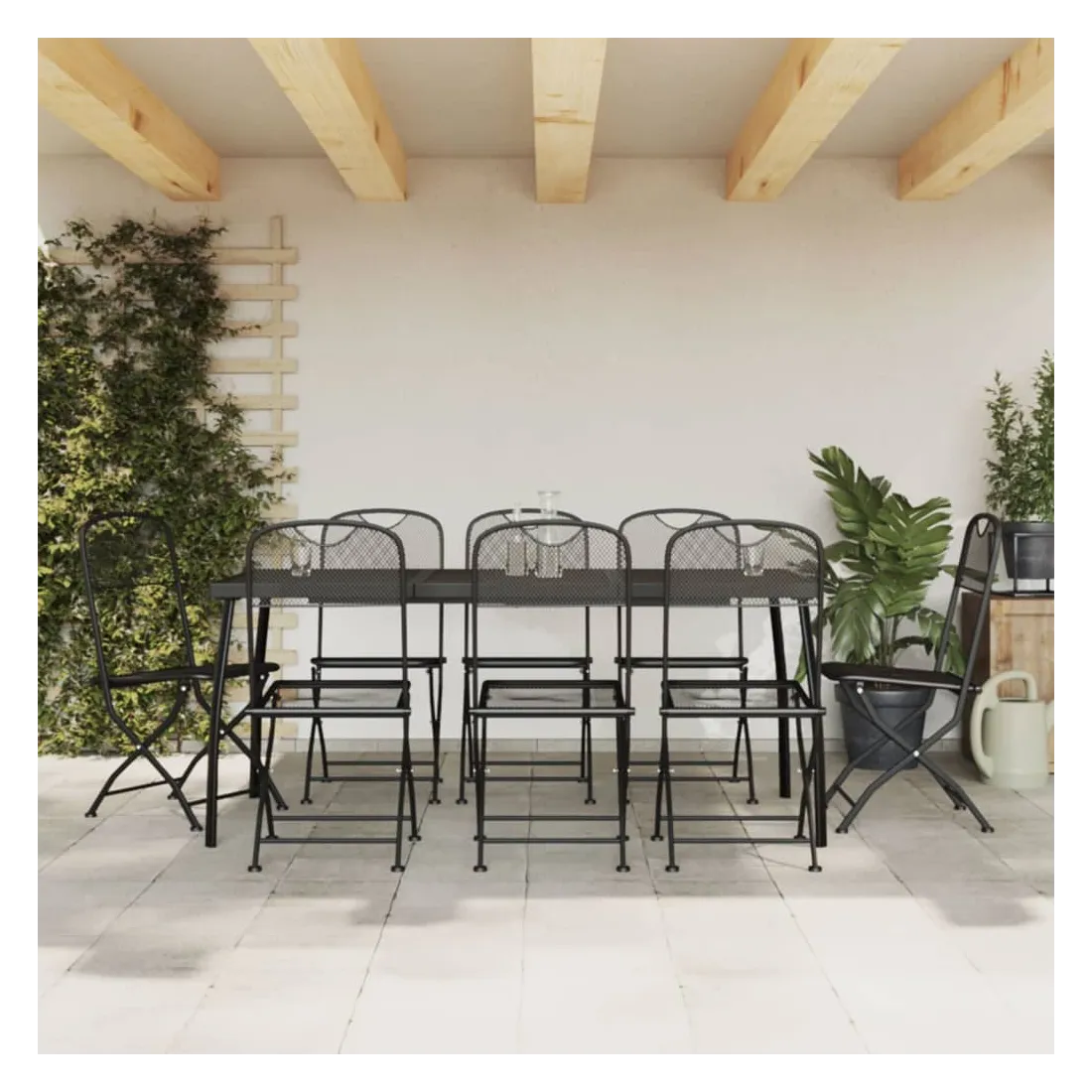 Profitez d'un bon repas ou d'un thé l'après-midi dans votre espace extérieur avec cet ensemble de salle à manger de jardin ! Ayant un design élégant, il deviendra le point central de votre jardin et de votre terrasse ! Cadre robuste : le cadre en métal rend cet ensemble de meubles de jardin robuste et durable, offrant un service à vie.Conception en maille : cet ensemble de salle à manger, avec son design en maille, peut efficacement éviter l'accumulation d'eau, ajoutant une apparence élégante à votre espace de vie extérieur.Dessus de table pratique : le dessus robuste de la table de jardin est parfait pour placer les repas, les boissons et d'autres objets décoratifs.Facile à déplacer : ces chaises à manger de jardin sont pliables pour gagner de la place lorsqu'elles ne sont pas utilisées. Vous pouvez facilement les transporter avec vous lors de vos sorties en plein air. Bon à savoir :Pour que vos meubles d'extérieur restent beaux, nous vous recommandons de les protéger avec une housse imperméable.