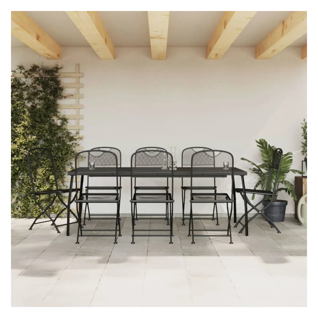 Profitez d'un bon repas ou d'un thé l'après-midi dans votre espace extérieur avec cet ensemble de salle à manger de jardin ! Ayant un design élégant, il deviendra le point central de votre jardin et de votre terrasse ! Cadre robuste : le cadre en métal rend cet ensemble de meubles de jardin robuste et durable, offrant un service à vie.Conception en maille : cet ensemble de salle à manger, avec son design en maille, peut efficacement éviter l'accumulation d'eau, ajoutant une apparence élégante à votre espace de vie extérieur.Dessus de table pratique : le dessus robuste de la table de jardin est parfait pour placer les repas, les boissons et d'autres objets décoratifs.Facile à déplacer : ces chaises à manger de jardin sont pliables pour gagner de la place lorsqu'elles ne sont pas utilisées. Vous pouvez facilement les transporter avec vous lors de vos sorties en plein air. Bon à savoir :Pour que vos meubles d'extérieur restent beaux, nous vous recommandons de les protéger avec une housse imperméable.