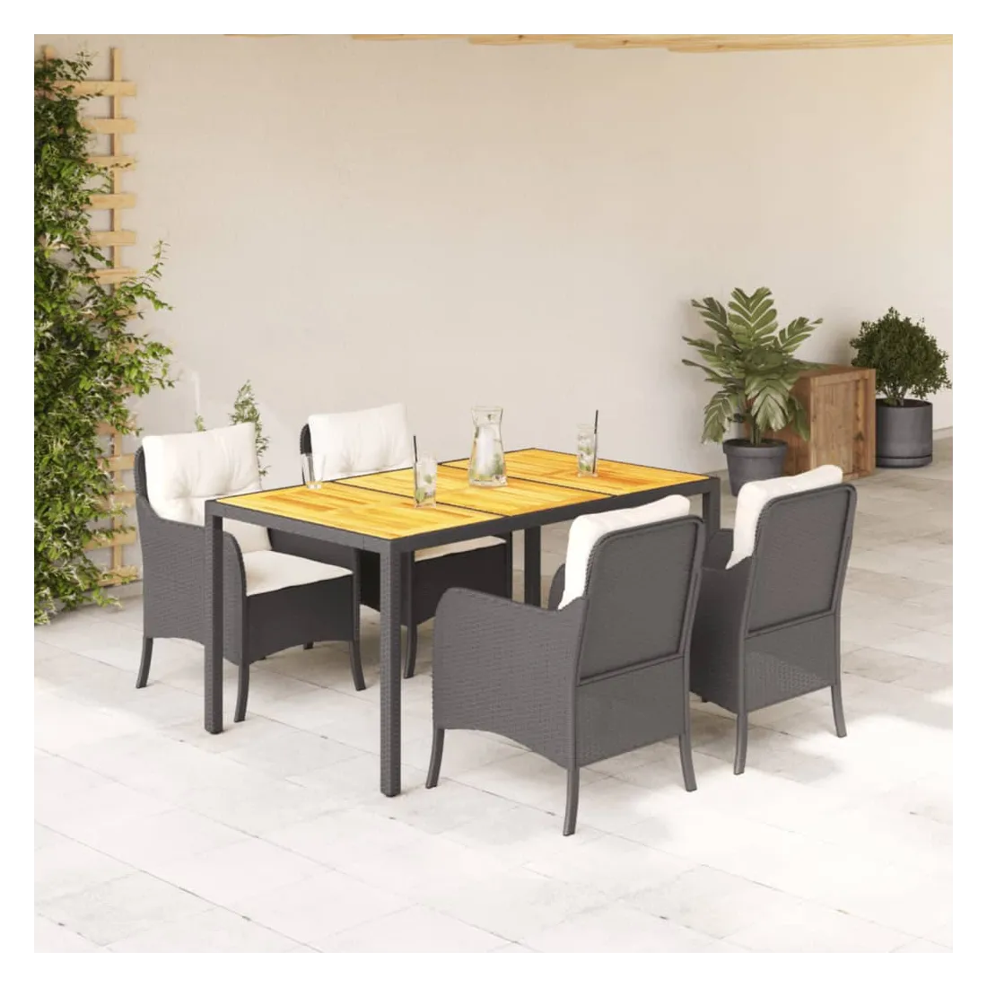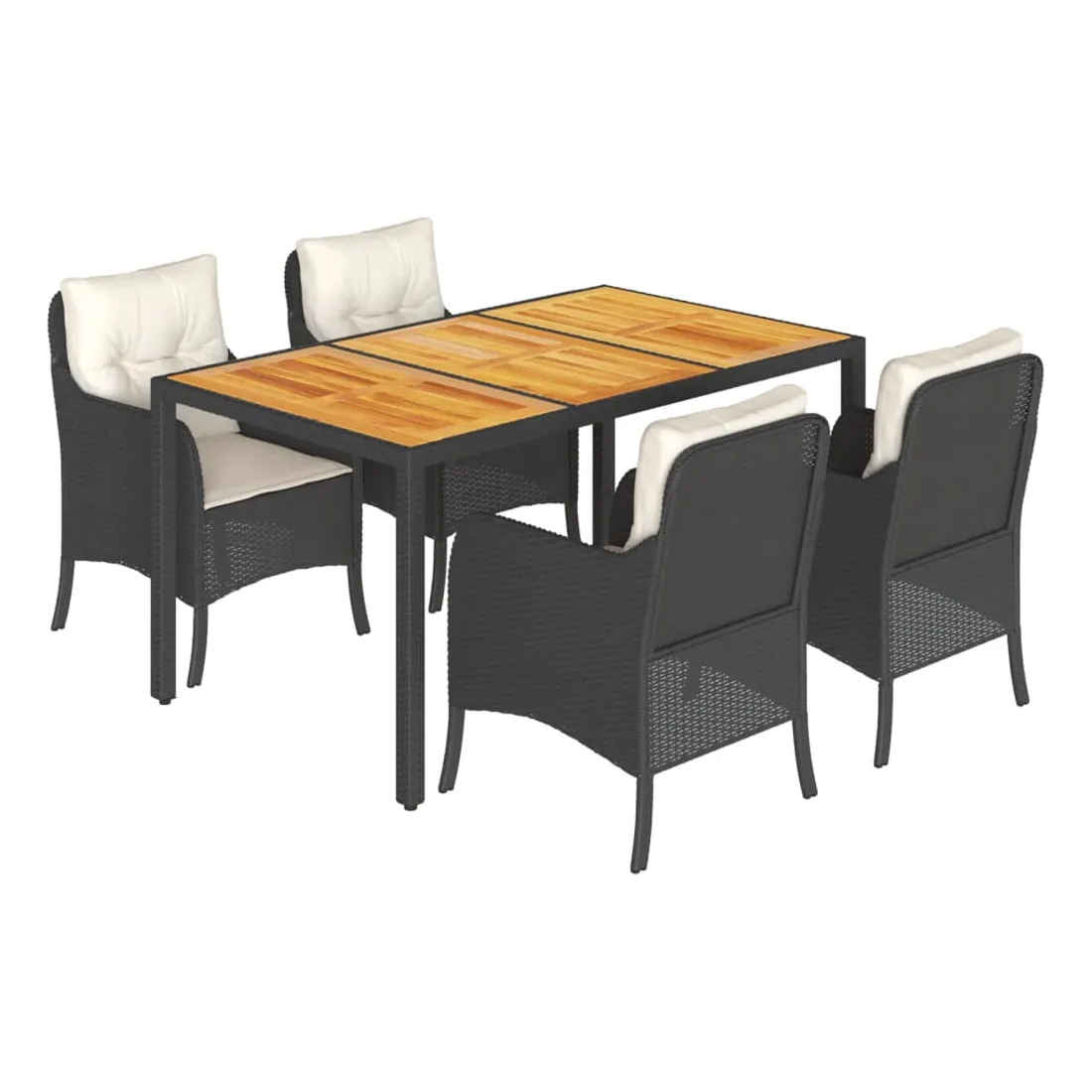 Cet ensemble de salle à manger de jardin est un excellent choix pour les repas en plein air ou pour vous détendre dans le jardin, l'arrière-cour ou le patio. Matériau durable : la résine tressée, également connue sous le nom de poly rotin, est un matériau synthétique solide et nécessitant peu d'entretien qui ressemble au rotin naturel. Il est léger, facile à nettoyer et couramment utilisé pour les meubles d'extérieur en raison de sa durabilité et de ses propriétés de résistance aux intempéries.Expérience d'assise confortable : ce mobilier d'extérieur, doté de coussins épais, offre une expérience d'assise confortable.Housse amovible et lavable : ces coussins de siège sont dotés de housses amovibles pour un lavage et un entretien faciles. Les housses de coussin de chaise ont un rabat à l'arrière pour une fixation facile aux chaises.Dessus stable et facile à nettoyer : cette table de jardin a un dessus en bois d'acacia robuste, durable et facile à nettoyer avec un chiffon humide.Cadre robuste et stable : le cadre en acier enduit de poudre assure la solidité et la stabilité du meuble de jardin pour une utilisation quotidienne à l'extérieur. Bon à savoir :Pour que vos meubles d'extérieur restent beaux, nous vous recommandons de les protéger avec une housse imperméable.