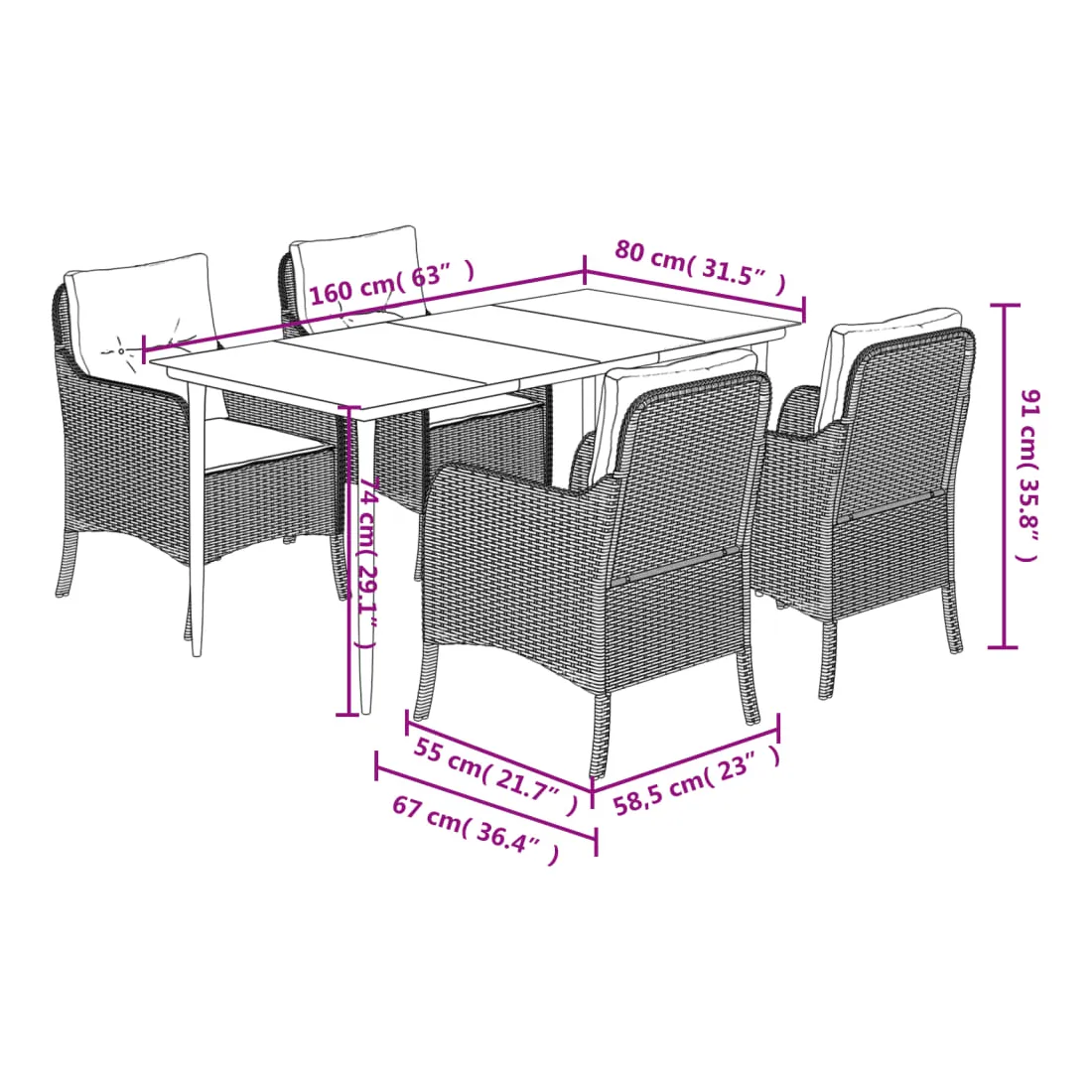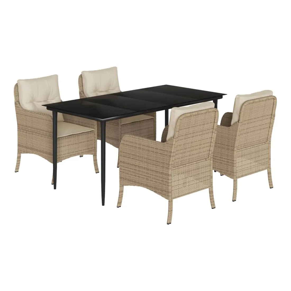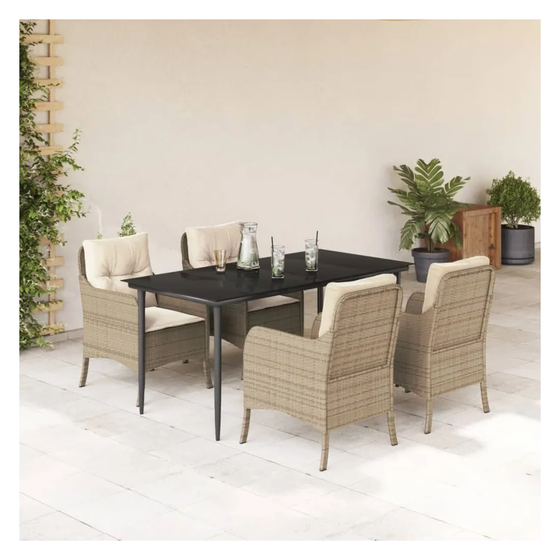 Cet ensemble de salle à manger de jardin est un excellent choix pour les repas en plein air ou pour vous détendre dans le jardin, l'arrière-cour ou le patio. Matériau durable : la résine tressée, également connue sous le nom de poly rotin, est un matériau synthétique solide et nécessitant peu d'entretien qui ressemble au rotin naturel. Il est léger, facile à nettoyer et couramment utilisé pour les meubles d'extérieur en raison de sa durabilité et de ses propriétés de résistance aux intempéries.Expérience d'assise confortable : ce mobilier d'extérieur, doté de coussins épais, offre une expérience d'assise confortable.Housse amovible et lavable : ces coussins de siège sont dotés de housses amovibles pour un lavage et un entretien faciles.Dessus en verre : le dessus de la table d'extérieur est fabriqué en verre trempé solide et durable, ce qui le rend facile à nettoyer avec un chiffon humide et ajoute une touche d'élégance à votre espace extérieur.Cadre robuste et stable : le cadre en acier enduit de poudre assure la solidité et la stabilité du meuble de jardin pour une utilisation quotidienne à l'extérieur. Bon à savoir :Pour que vos meubles d'extérieur restent beaux, nous vous recommandons de les protéger avec une housse imperméable.