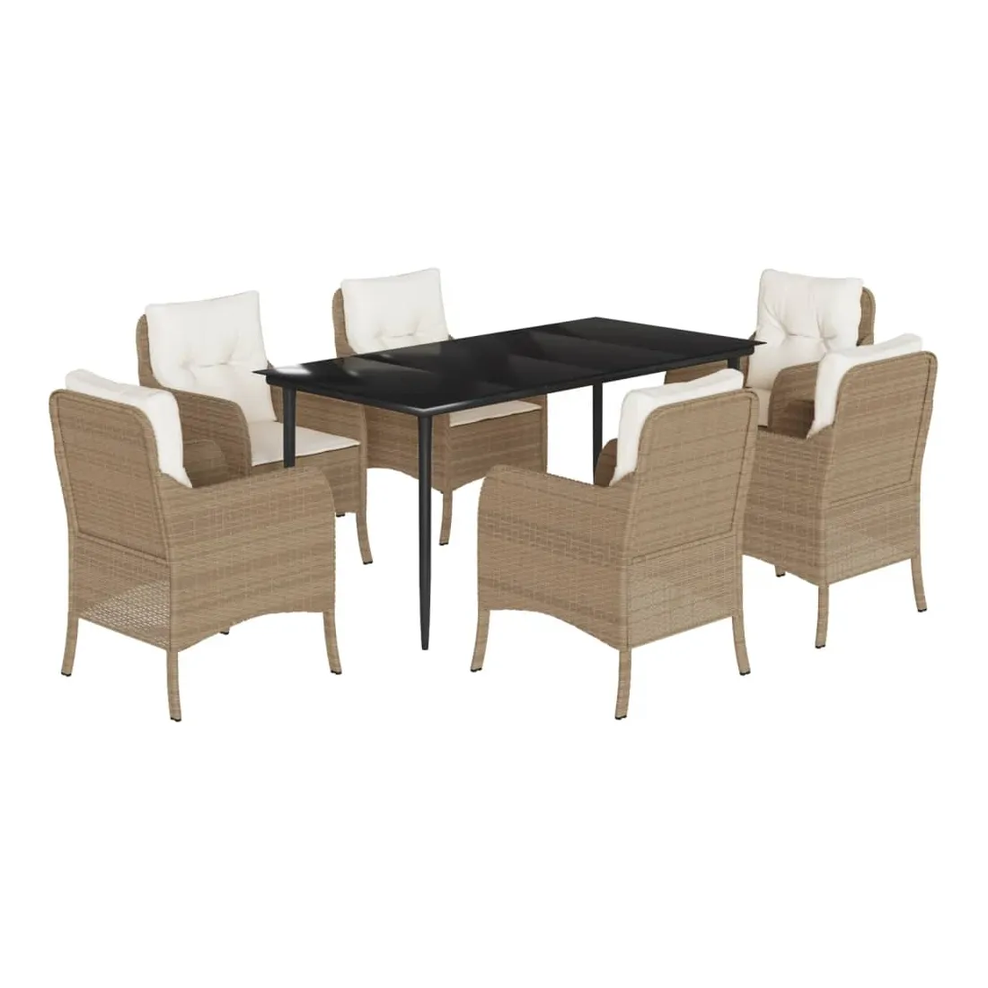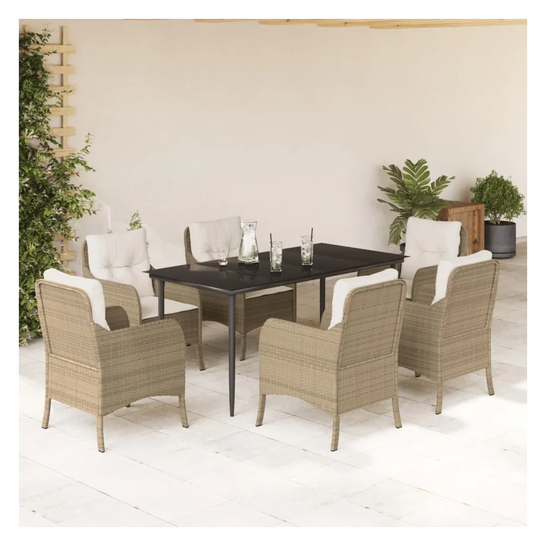 Cet ensemble de salle à manger de jardin est un excellent choix pour les repas en plein air ou pour vous détendre dans le jardin, l'arrière-cour ou le patio. Matériau durable : la résine tressée, également connue sous le nom de poly rotin, est un matériau synthétique solide et nécessitant peu d'entretien qui ressemble au rotin naturel. Il est léger, facile à nettoyer et couramment utilisé pour les meubles d'extérieur en raison de sa durabilité et de ses propriétés de résistance aux intempéries.Expérience d'assise confortable : ce mobilier d'extérieur, doté de coussins épais, offre une expérience d'assise confortable.Housse amovible et lavable : ces coussins de siège sont dotés de housses amovibles pour un lavage et un entretien faciles.Dessus en verre : le dessus de la table d'extérieur est fabriqué en verre trempé solide et durable, ce qui le rend facile à nettoyer avec un chiffon humide et ajoute une touche d'élégance à votre espace extérieur.Cadre robuste et stable : le cadre en acier enduit de poudre assure la solidité et la stabilité du meuble de jardin pour une utilisation quotidienne à l'extérieur. Bon à savoir :Pour que vos meubles d'extérieur restent beaux, nous vous recommandons de les protéger avec une housse imperméable.