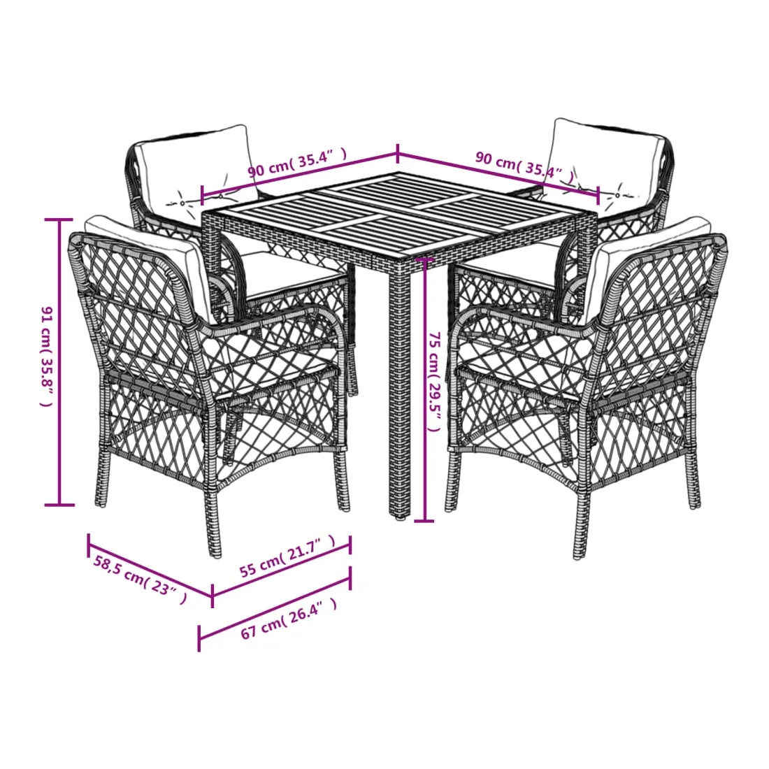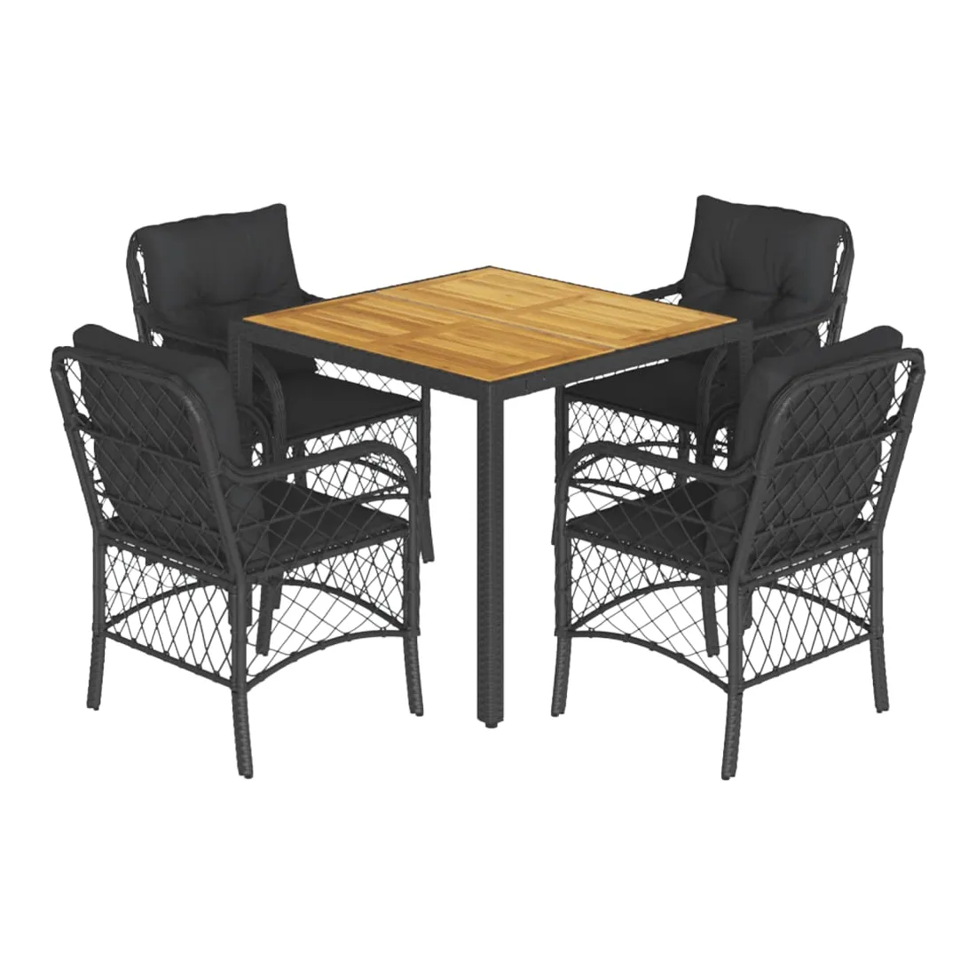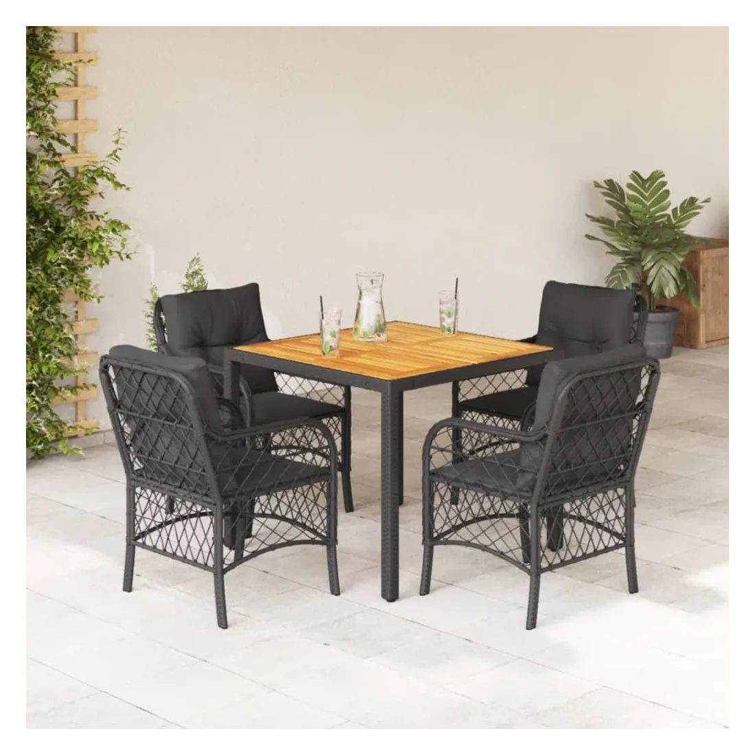 Cet ensemble de salle à manger de jardin est un excellent choix pour les repas en plein air ou pour vous détendre dans le jardin, l'arrière-cour ou le patio. Matériau durable : la résine tressée, également connue sous le nom de poly rotin, est un matériau synthétique solide et nécessitant peu d'entretien qui ressemble au rotin naturel. Il est léger, facile à nettoyer et couramment utilisé pour les meubles d'extérieur en raison de sa durabilité et de ses propriétés de résistance aux intempéries.Expérience d'assise confortable : ce mobilier d'extérieur, doté de coussins épais, offre une expérience d'assise confortable.Housse amovible et lavable : ces coussins de siège sont dotés de housses amovibles pour un lavage et un entretien faciles. Dessus stable et facile à nettoyer : cette table de jardin a un dessus en bois d'acacia robuste, durable et facile à nettoyer avec un chiffon humide.Cadre robuste et stable : le cadre en acier enduit de poudre assure la solidité et la stabilité du meuble de jardin pour une utilisation quotidienne à l'extérieur. Bon à savoir :Pour que vos meubles d'extérieur restent beaux, nous vous recommandons de les protéger avec une housse imperméable.