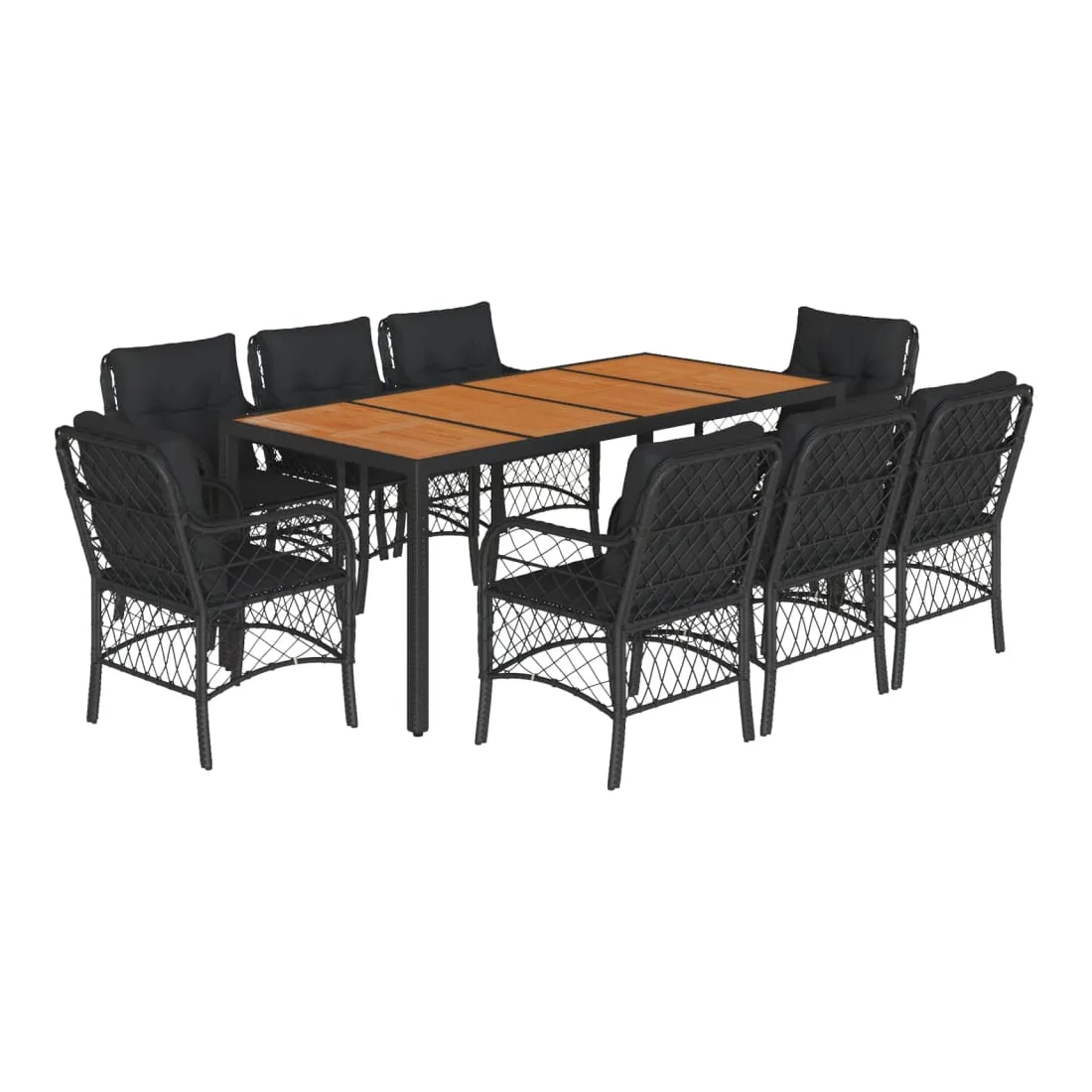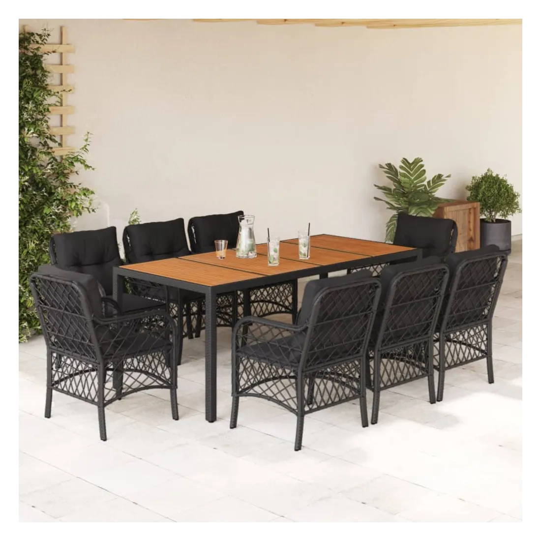 Cet ensemble de salle à manger de jardin est un excellent choix pour les repas en plein air ou pour vous détendre dans le jardin, l'arrière-cour ou le patio. Matériau durable : la résine tressée, également connue sous le nom de poly rotin, est un matériau synthétique solide et nécessitant peu d'entretien qui ressemble au rotin naturel. Il est léger, facile à nettoyer et couramment utilisé pour les meubles d'extérieur en raison de sa durabilité et de ses propriétés de résistance aux intempéries.Expérience d'assise confortable : ce mobilier d'extérieur, doté de coussins épais, offre une expérience d'assise confortable.Housse amovible et lavable : ces coussins de siège sont dotés de housses amovibles pour un lavage et un entretien faciles. Dessus stable et facile à nettoyer : cette table de jardin a un dessus en bois d'acacia robuste, durable et facile à nettoyer avec un chiffon humide.Cadre robuste et stable : le cadre en acier enduit de poudre assure la solidité et la stabilité du meuble de jardin pour une utilisation quotidienne à l'extérieur. Bon à savoir :Pour que vos meubles d'extérieur restent beaux, nous vous recommandons de les protéger avec une housse imperméable.