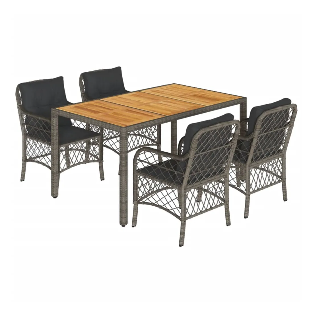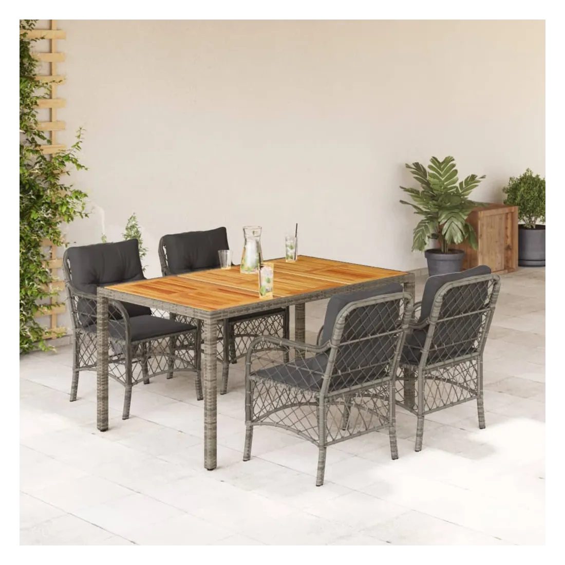 Cet ensemble de salle à manger de jardin est un excellent choix pour les repas en plein air ou pour vous détendre dans le jardin, l'arrière-cour ou le patio. Matériau durable : la résine tressée, également connue sous le nom de poly rotin, est un matériau synthétique solide et nécessitant peu d'entretien qui ressemble au rotin naturel. Il est léger, facile à nettoyer et couramment utilisé pour les meubles d'extérieur en raison de sa durabilité et de ses propriétés de résistance aux intempéries.Expérience d'assise confortable : ce mobilier d'extérieur, doté de coussins épais, offre une expérience d'assise confortable.Housse amovible et lavable : ces coussins de siège sont dotés de housses amovibles pour un lavage et un entretien faciles. Dessus stable et facile à nettoyer : cette table de jardin a un dessus en bois d'acacia robuste, durable et facile à nettoyer avec un chiffon humide.Cadre robuste et stable : le cadre en acier enduit de poudre assure la solidité et la stabilité du meuble de jardin pour une utilisation quotidienne à l'extérieur. Bon à savoir :Pour que vos meubles d'extérieur restent beaux, nous vous recommandons de les protéger avec une housse imperméable.