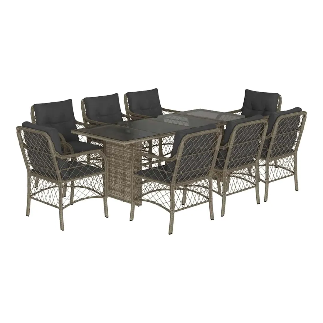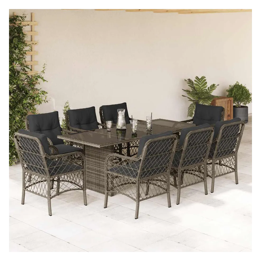 Cet ensemble de salle à manger de jardin est un excellent choix pour les repas en plein air ou pour vous détendre dans le jardin, l'arrière-cour ou le patio. Matériau durable : la résine tressée, également connue sous le nom de poly rotin, est un matériau synthétique solide et nécessitant peu d'entretien qui ressemble au rotin naturel. Il est léger, facile à nettoyer et couramment utilisé pour les meubles d'extérieur en raison de sa durabilité et de ses propriétés de résistance aux intempéries.Expérience d'assise confortable : ce mobilier d'extérieur, doté de coussins épais, offre une expérience d'assise confortable.Housse amovible et lavable : ces coussins de siège sont dotés de housses amovibles pour un lavage et un entretien faciles.Dessus en verre : le dessus de la table d'extérieur est fabriqué en verre trempé solide et durable, ce qui le rend facile à nettoyer avec un chiffon humide et ajoute une touche d'élégance à votre espace extérieur.Cadre robuste et stable : le cadre en acier enduit de poudre assure la solidité et la stabilité du meuble de jardin pour une utilisation quotidienne à l'extérieur. Bon à savoir :Pour que vos meubles d'extérieur restent beaux, nous vous recommandons de les protéger avec une housse imperméable.