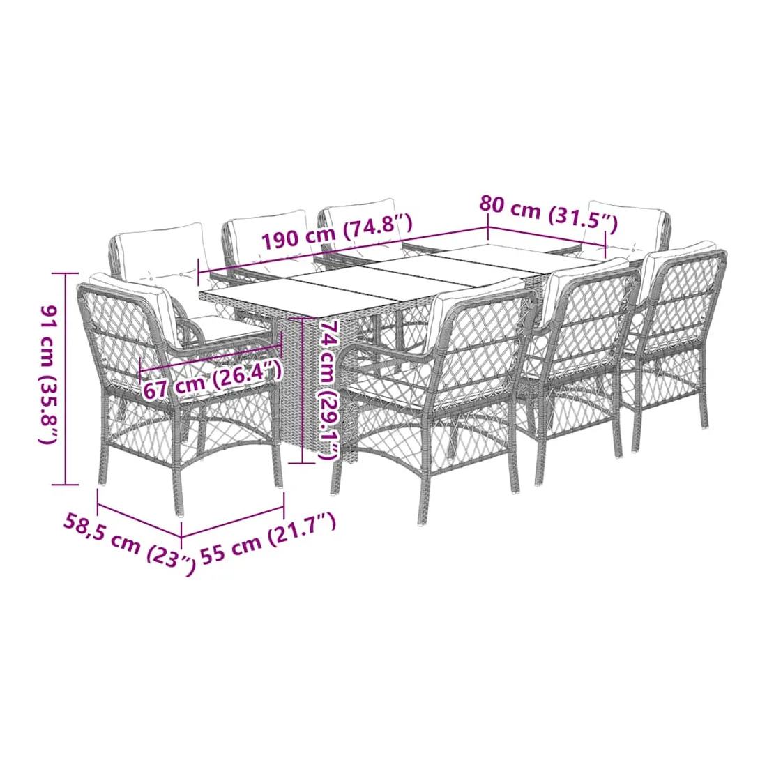 - Dimensions : 190 x 80 x 74 cm (l x P x H)