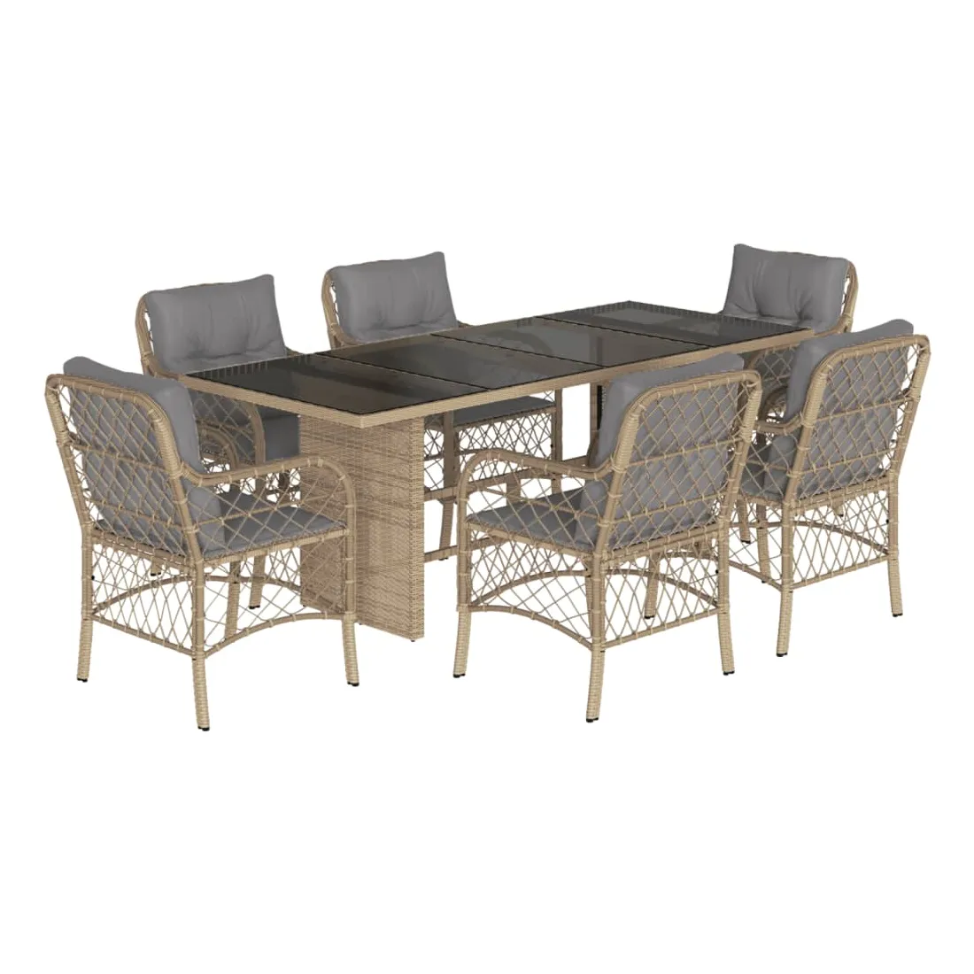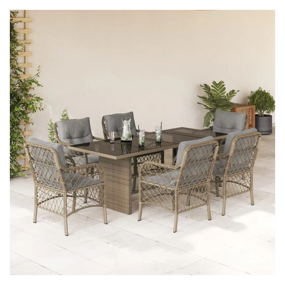 Cet ensemble de salle à manger de jardin est un excellent choix pour les repas en plein air ou pour vous détendre dans le jardin, l'arrière-cour ou le patio. Matériau durable : la résine tressée, également connue sous le nom de poly rotin, est un matériau synthétique solide et nécessitant peu d'entretien qui ressemble au rotin naturel. Il est léger, facile à nettoyer et couramment utilisé pour les meubles d'extérieur en raison de sa durabilité et de ses propriétés de résistance aux intempéries.Expérience d'assise confortable : ce mobilier d'extérieur, doté de coussins épais, offre une expérience d'assise confortable.Housse amovible et lavable : ces coussins de siège sont dotés de housses amovibles pour un lavage et un entretien faciles.Dessus en verre : le dessus de la table d'extérieur est fabriqué en verre trempé solide et durable, ce qui le rend facile à nettoyer avec un chiffon humide et ajoute une touche d'élégance à votre espace extérieur.Cadre robuste et stable : le cadre en acier enduit de poudre assure la solidité et la stabilité du meuble de jardin pour une utilisation quotidienne à l'extérieur. Bon à savoir :Pour que vos meubles d'extérieur restent beaux, nous vous recommandons de les protéger avec une housse imperméable.