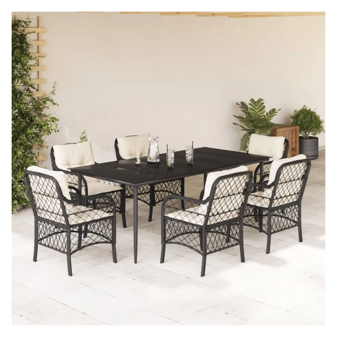 Cet ensemble de salle à manger de jardin est un excellent choix pour les repas en plein air ou pour vous détendre dans le jardin, l'arrière-cour ou le patio. Matériau durable : la résine tressée, également connue sous le nom de poly rotin, est un matériau synthétique solide et nécessitant peu d'entretien qui ressemble au rotin naturel. Il est léger, facile à nettoyer et couramment utilisé pour les meubles d'extérieur en raison de sa durabilité et de ses propriétés de résistance aux intempéries.Expérience d'assise confortable : ce mobilier d'extérieur, doté de coussins épais, offre une expérience d'assise confortable.Housse amovible et lavable : ces coussins de siège sont dotés de housses amovibles pour un lavage et un entretien faciles.Dessus en verre : le dessus de la table d'extérieur est fabriqué en verre trempé solide et durable, ce qui le rend facile à nettoyer avec un chiffon humide et ajoute une touche d'élégance à votre espace extérieur.Cadre robuste et stable : le cadre en acier enduit de poudre assure la solidité et la stabilité du meuble de jardin pour une utilisation quotidienne à l'extérieur. Bon à savoir :Pour que vos meubles d'extérieur restent beaux, nous vous recommandons de les protéger avec une housse imperméable.