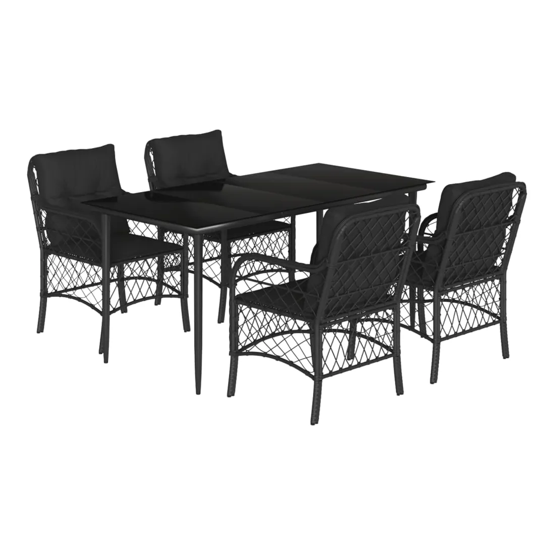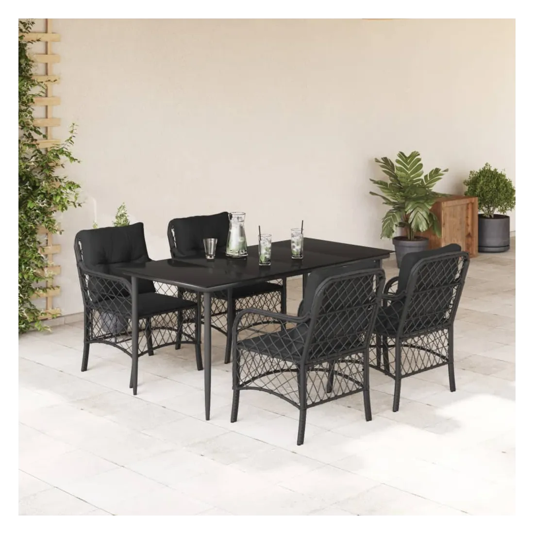 Cet ensemble de salle à manger de jardin est un excellent choix pour les repas en plein air ou pour vous détendre dans le jardin, l'arrière-cour ou le patio. Matériau durable : la résine tressée, également connue sous le nom de poly rotin, est un matériau synthétique solide et nécessitant peu d'entretien qui ressemble au rotin naturel. Il est léger, facile à nettoyer et couramment utilisé pour les meubles d'extérieur en raison de sa durabilité et de ses propriétés de résistance aux intempéries.Expérience d'assise confortable : ce mobilier d'extérieur, doté de coussins épais, offre une expérience d'assise confortable.Housse amovible et lavable : ces coussins de siège sont dotés de housses amovibles pour un lavage et un entretien faciles.Dessus en verre : le dessus de la table d'extérieur est fabriqué en verre trempé solide et durable, ce qui le rend facile à nettoyer avec un chiffon humide et ajoute une touche d'élégance à votre espace extérieur.Cadre robuste et stable : le cadre en acier enduit de poudre assure la solidité et la stabilité du meuble de jardin pour une utilisation quotidienne à l'extérieur. Bon à savoir :Pour que vos meubles d'extérieur restent beaux, nous vous recommandons de les protéger avec une housse imperméable.