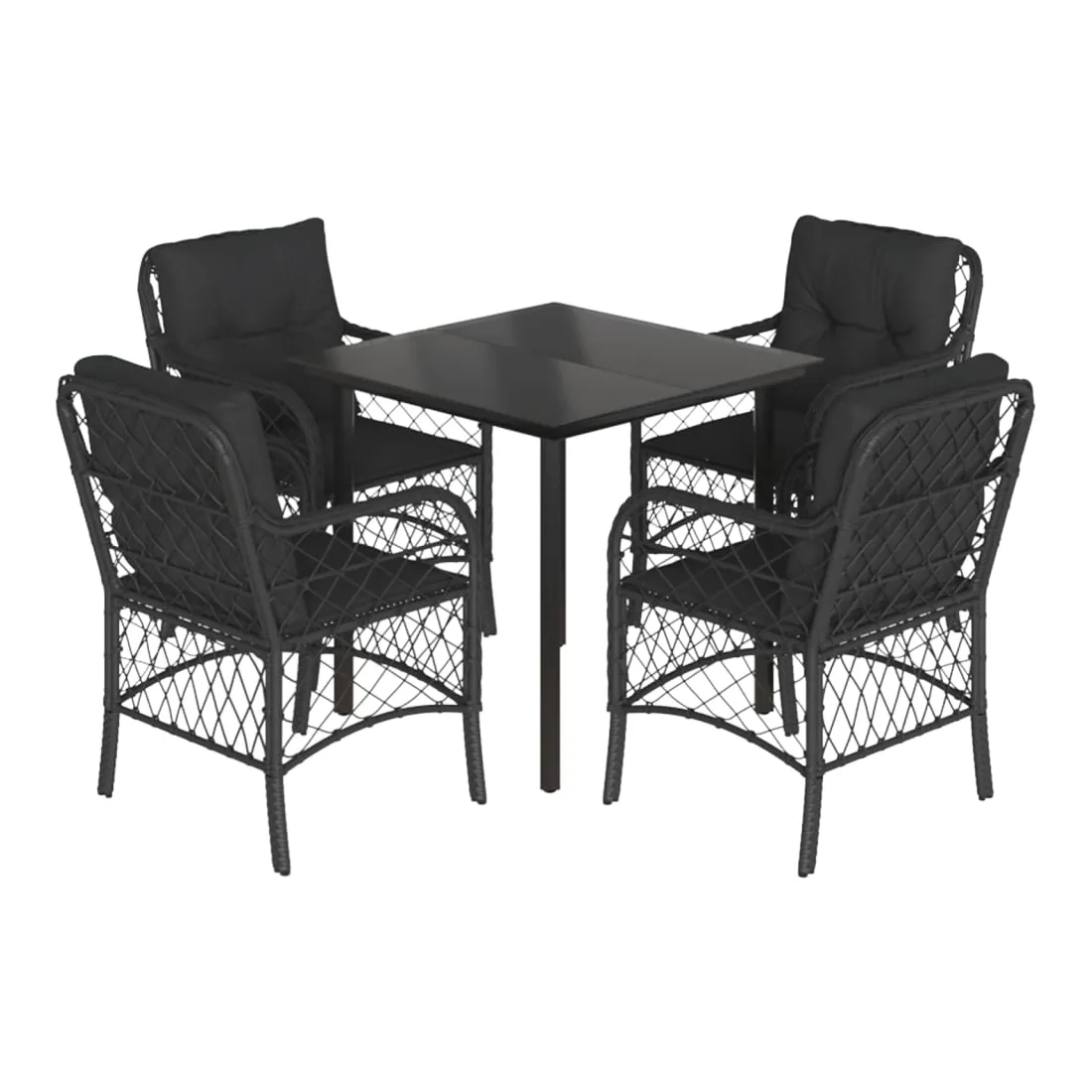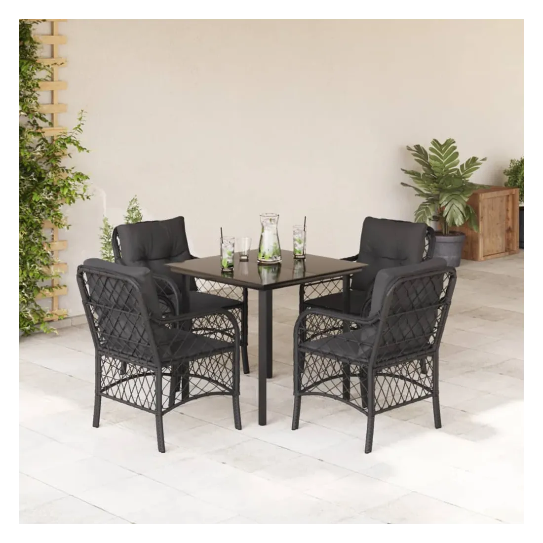 Cet ensemble de salle à manger de jardin est un excellent choix pour les repas en plein air ou pour vous détendre dans le jardin, l'arrière-cour ou le patio. Matériau durable : la résine tressée, également connue sous le nom de poly rotin, est un matériau synthétique solide et nécessitant peu d'entretien qui ressemble au rotin naturel. Il est léger, facile à nettoyer et couramment utilisé pour les meubles d'extérieur en raison de sa durabilité et de ses propriétés de résistance aux intempéries.Expérience d'assise confortable : ce mobilier d'extérieur, doté de coussins épais, offre une expérience d'assise confortable.Housse amovible et lavable : ces coussins de siège sont dotés de housses amovibles pour un lavage et un entretien faciles.Dessus en verre : le dessus de la table d'extérieur est fabriqué en verre trempé solide et durable, ce qui le rend facile à nettoyer avec un chiffon humide et ajoute une touche d'élégance à votre espace extérieur.Cadre robuste et stable : le cadre en acier enduit de poudre assure la solidité et la stabilité du meuble de jardin pour une utilisation quotidienne à l'extérieur. Bon à savoir :Pour que vos meubles d'extérieur restent beaux, nous vous recommandons de les protéger avec une housse imperméable.