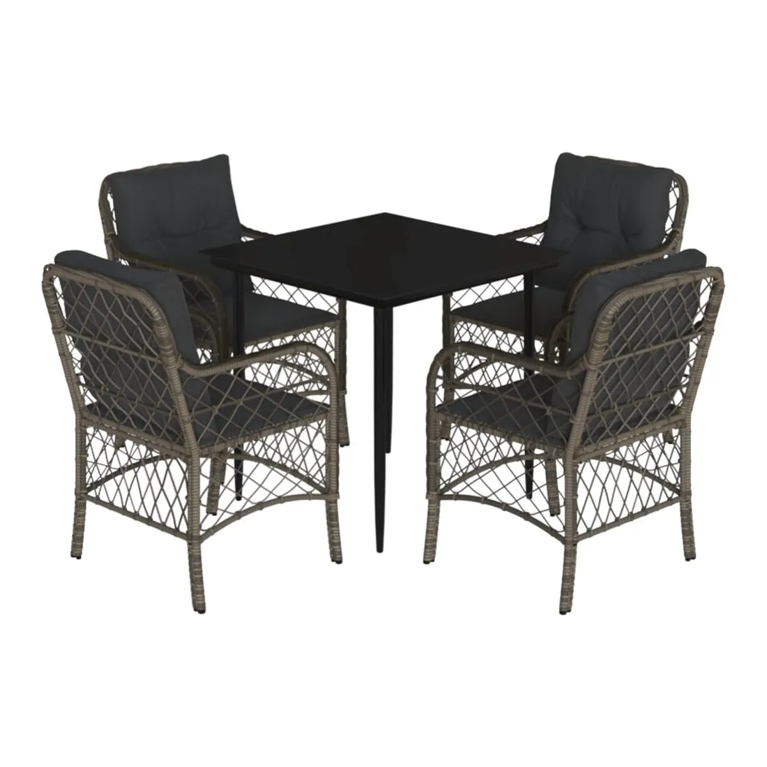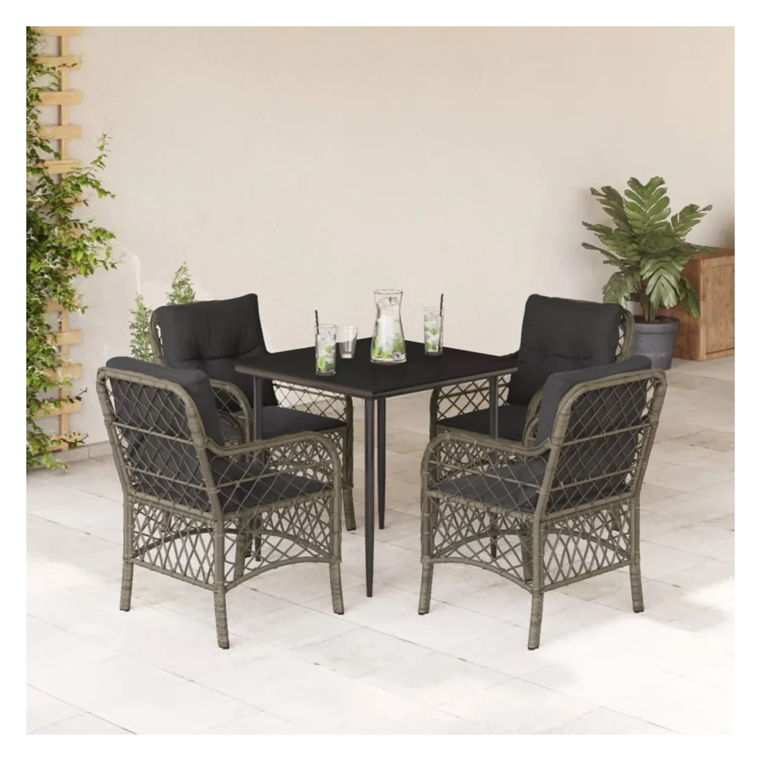 Cet ensemble de salle à manger de jardin est un excellent choix pour les repas en plein air ou pour vous détendre dans le jardin, l'arrière-cour ou le patio. Matériau durable : la résine tressée, également connue sous le nom de poly rotin, est un matériau synthétique solide et nécessitant peu d'entretien qui ressemble au rotin naturel. Il est léger, facile à nettoyer et couramment utilisé pour les meubles d'extérieur en raison de sa durabilité et de ses propriétés de résistance aux intempéries.Expérience d'assise confortable : ce mobilier d'extérieur, doté de coussins épais, offre une expérience d'assise confortable.Housse amovible et lavable : ces coussins de siège sont dotés de housses amovibles pour un lavage et un entretien faciles.Dessus en verre : le dessus de la table d'extérieur est fabriqué en verre trempé solide et durable, ce qui le rend facile à nettoyer avec un chiffon humide et ajoute une touche d'élégance à votre espace extérieur.Cadre robuste et stable : le cadre en acier enduit de poudre assure la solidité et la stabilité du meuble de jardin pour une utilisation quotidienne à l'extérieur. Bon à savoir :Pour que vos meubles d'extérieur restent beaux, nous vous recommandons de les protéger avec une housse imperméable.