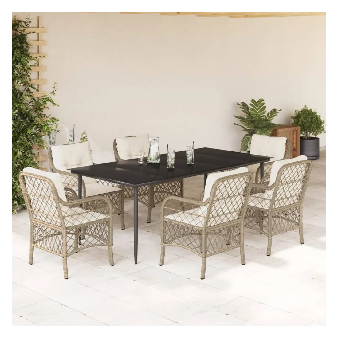 Cet ensemble de salle à manger de jardin est un excellent choix pour les repas en plein air ou pour vous détendre dans le jardin, l'arrière-cour ou le patio. Matériau durable : la résine tressée, également connue sous le nom de poly rotin, est un matériau synthétique solide et nécessitant peu d'entretien qui ressemble au rotin naturel. Il est léger, facile à nettoyer et couramment utilisé pour les meubles d'extérieur en raison de sa durabilité et de ses propriétés de résistance aux intempéries.Expérience d'assise confortable : ce mobilier d'extérieur, doté de coussins épais, offre une expérience d'assise confortable.Housse amovible et lavable : ces coussins de siège sont dotés de housses amovibles pour un lavage et un entretien faciles.Dessus en verre : le dessus de la table d'extérieur est fabriqué en verre trempé solide et durable, ce qui le rend facile à nettoyer avec un chiffon humide et ajoute une touche d'élégance à votre espace extérieur.Cadre robuste et stable : le cadre en acier enduit de poudre assure la solidité et la stabilité du meuble de jardin pour une utilisation quotidienne à l'extérieur. Bon à savoir :Pour que vos meubles d'extérieur restent beaux, nous vous recommandons de les protéger avec une housse imperméable.