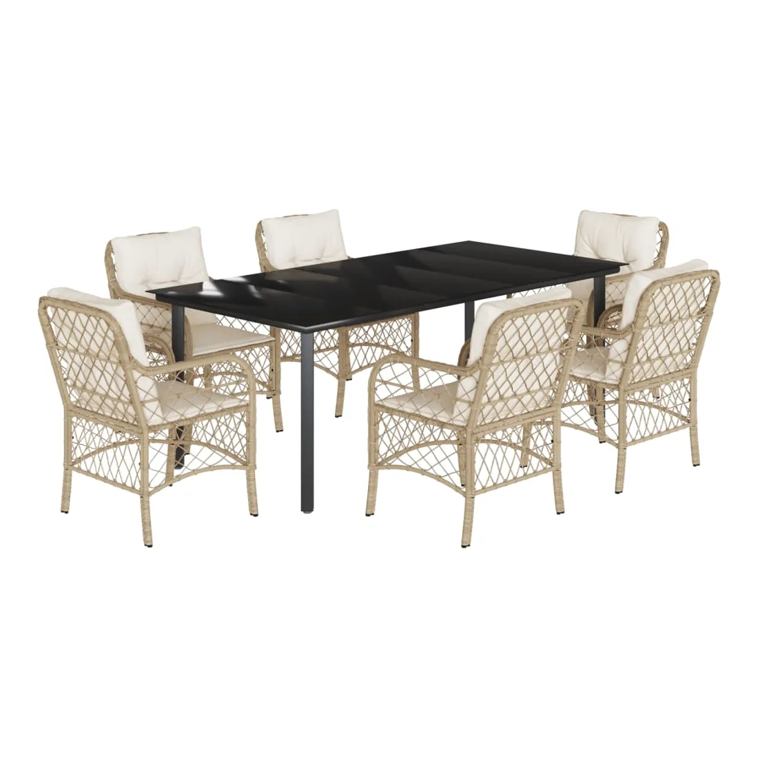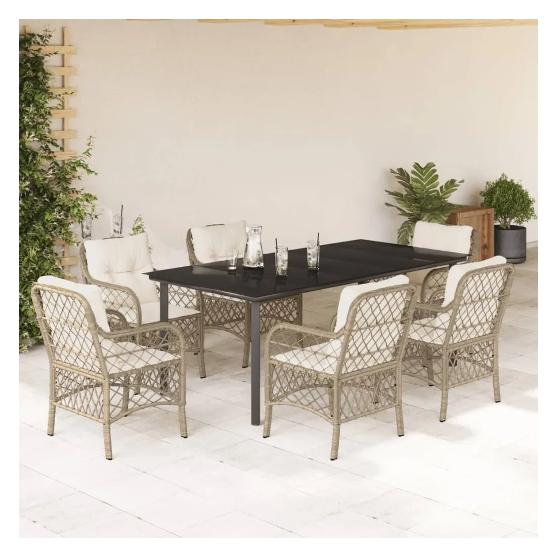 Cet ensemble de salle à manger de jardin est un excellent choix pour les repas en plein air ou pour vous détendre dans le jardin, l'arrière-cour ou le patio. Matériau durable : la résine tressée, également connue sous le nom de poly rotin, est un matériau synthétique solide et nécessitant peu d'entretien qui ressemble au rotin naturel. Il est léger, facile à nettoyer et couramment utilisé pour les meubles d'extérieur en raison de sa durabilité et de ses propriétés de résistance aux intempéries.Expérience d'assise confortable : ce mobilier d'extérieur, doté de coussins épais, offre une expérience d'assise confortable.Housse amovible et lavable : ces coussins de siège sont dotés de housses amovibles pour un lavage et un entretien faciles.Dessus en verre : le dessus de la table d'extérieur est fabriqué en verre trempé solide et durable, ce qui le rend facile à nettoyer avec un chiffon humide et ajoute une touche d'élégance à votre espace extérieur.Cadre robuste et stable : le cadre en acier enduit de poudre assure la solidité et la stabilité du meuble de jardin pour une utilisation quotidienne à l'extérieur. Bon à savoir :Pour que vos meubles d'extérieur restent beaux, nous vous recommandons de les protéger avec une housse imperméable.