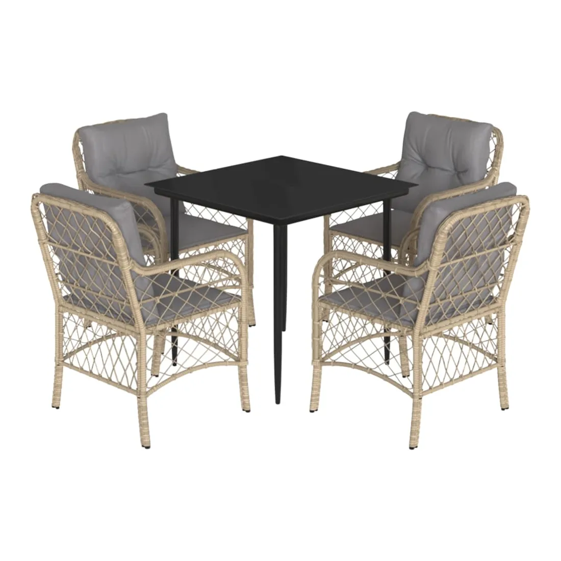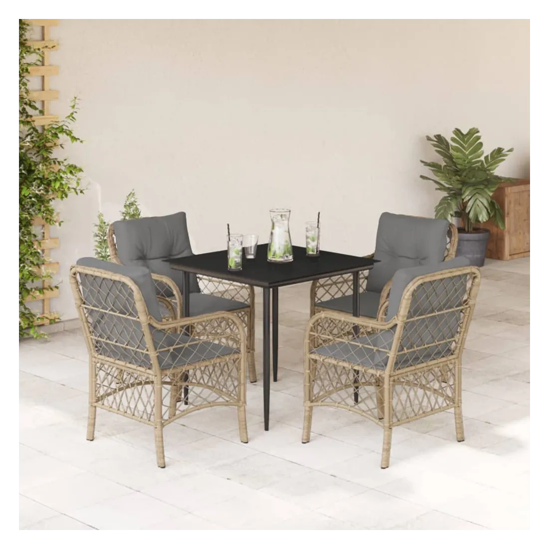 Cet ensemble de salle à manger de jardin est un excellent choix pour les repas en plein air ou pour vous détendre dans le jardin, l'arrière-cour ou le patio. Matériau durable : la résine tressée, également connue sous le nom de poly rotin, est un matériau synthétique solide et nécessitant peu d'entretien qui ressemble au rotin naturel. Il est léger, facile à nettoyer et couramment utilisé pour les meubles d'extérieur en raison de sa durabilité et de ses propriétés de résistance aux intempéries.Expérience d'assise confortable : ce mobilier d'extérieur, doté de coussins épais, offre une expérience d'assise confortable.Housse amovible et lavable : ces coussins de siège sont dotés de housses amovibles pour un lavage et un entretien faciles.Dessus en verre : le dessus de la table d'extérieur est fabriqué en verre trempé solide et durable, ce qui le rend facile à nettoyer avec un chiffon humide et ajoute une touche d'élégance à votre espace extérieur.Cadre robuste et stable : le cadre en acier enduit de poudre assure la solidité et la stabilité du meuble de jardin pour une utilisation quotidienne à l'extérieur. Bon à savoir :Pour que vos meubles d'extérieur restent beaux, nous vous recommandons de les protéger avec une housse imperméable.