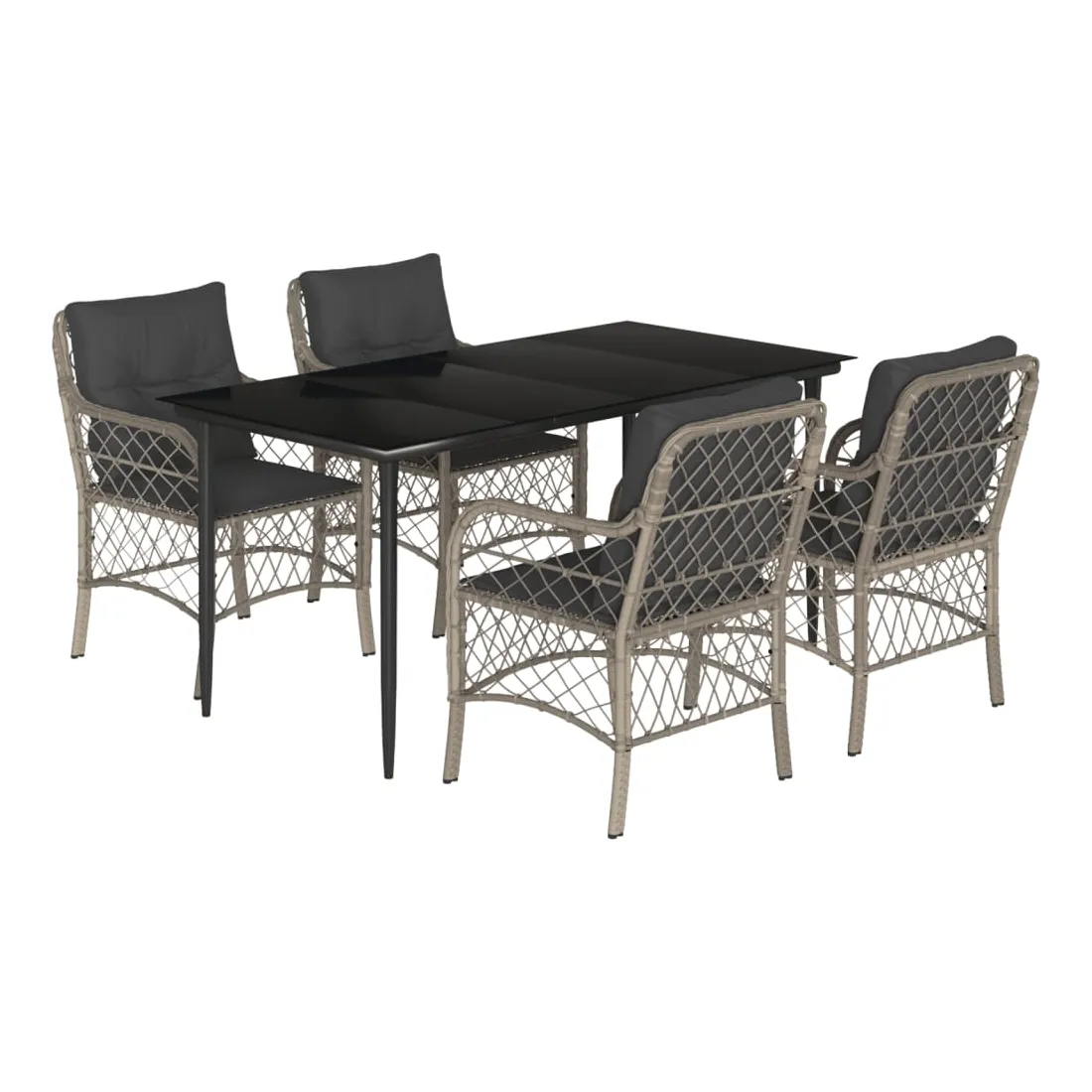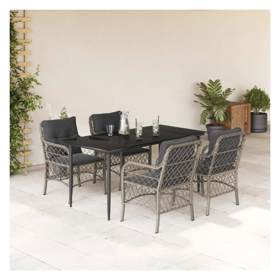 Cet ensemble de salle à manger de jardin est un excellent choix pour les repas en plein air ou pour vous détendre dans le jardin, l'arrière-cour ou le patio. Matériau durable : la résine tressée, également connue sous le nom de poly rotin, est un matériau synthétique solide et nécessitant peu d'entretien qui ressemble au rotin naturel. Il est léger, facile à nettoyer et couramment utilisé pour les meubles d'extérieur en raison de sa durabilité et de ses propriétés de résistance aux intempéries.Expérience d'assise confortable : ce mobilier d'extérieur, doté de coussins épais, offre une expérience d'assise confortable.Housse amovible et lavable : ces coussins de siège sont dotés de housses amovibles pour un lavage et un entretien faciles.Dessus en verre : le dessus de la table d'extérieur est fabriqué en verre trempé solide et durable, ce qui le rend facile à nettoyer avec un chiffon humide et ajoute une touche d'élégance à votre espace extérieur.Cadre robuste et stable : le cadre en acier enduit de poudre assure la solidité et la stabilité du meuble de jardin pour une utilisation quotidienne à l'extérieur. Bon à savoir :Pour que vos meubles d'extérieur restent beaux, nous vous recommandons de les protéger avec une housse imperméable.