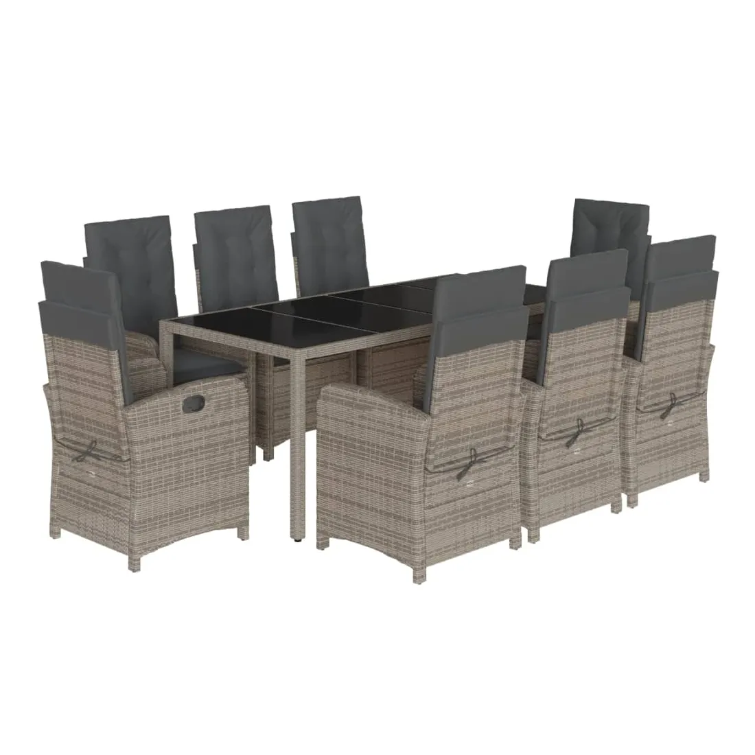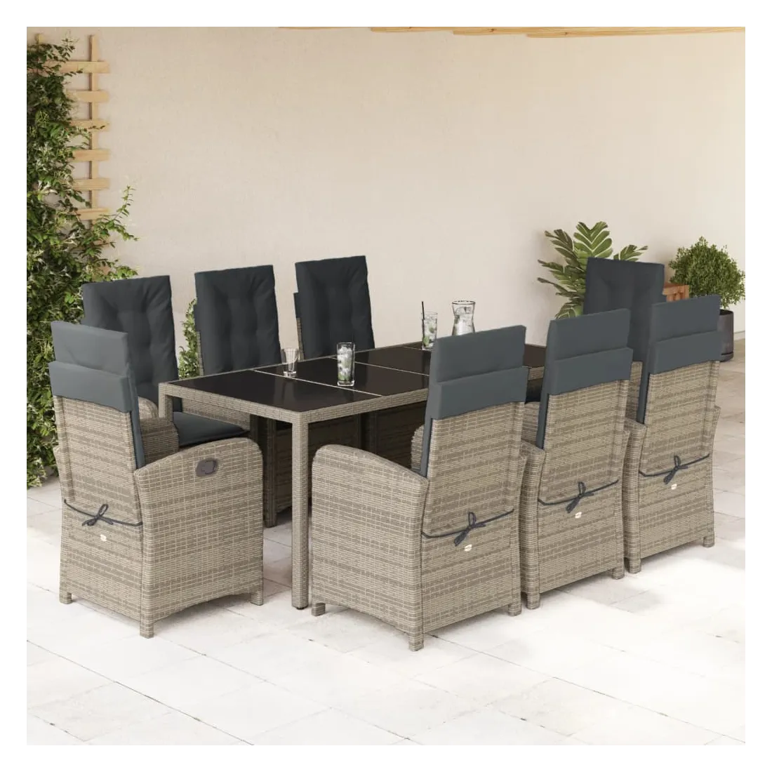 Cet ensemble de salle à manger de jardin est un excellent choix pour les repas en plein air ou pour vous détendre dans le jardin, dans l'arrière-cour ou sur la terrasse. Matériau durable : la résine tressée, également connue sous le nom de poly rotin, est un matériau synthétique solide et nécessitant peu d'entretien qui ressemble au rotin naturel. Il est léger, facile à nettoyer et couramment utilisé pour les meubles d'extérieur en raison de sa durabilité et de ses propriétés de résistance aux intempéries.Dossier réglable : ce siège de jardin est doté d'une poignée. Vous pouvez régler le dossier dans n'importe quelle position en tirant sur la poignée et le remettre rapidement dans sa position initiale.Expérience d'assise confortable : ce mobilier d'extérieur, doté de coussins épais, offre une expérience d'assise confortable.Housse amovible et lavable : ces coussins de siège sont dotés de housses amovibles pour un lavage et un entretien faciles. Les coussins de dossier ont un rabat à l'arrière pour une fixation facile aux dossiers.Dessus en verre : le dessus de la table d'extérieur est fabriqué en verre trempé solide et durable, ce qui le rend facile à nettoyer avec un chiffon humide et ajoute une touche d'élégance à votre espace extérieur. Bon à savoir :Pour que vos meubles d'extérieur restent beaux, nous vous recommandons de les protéger avec une housse imperméable.